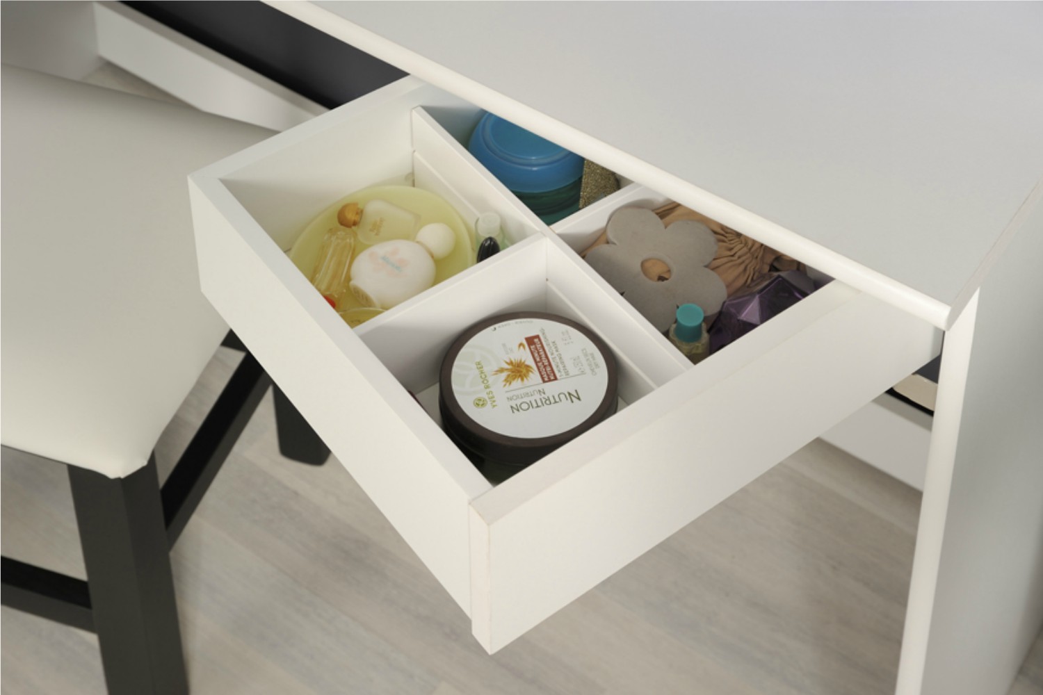 There are 4 shelves on either side of the mirror that can hold larger items such as perfume and jewellery boxes. Additional storage drawers underneath each side of the spacious countertop are perfect for hiding larger items. These have a pivoting mechanism to maximum space, with 4 compartments inside which are ideal for organising smaller accessories or keeping more valuable items out of sight.