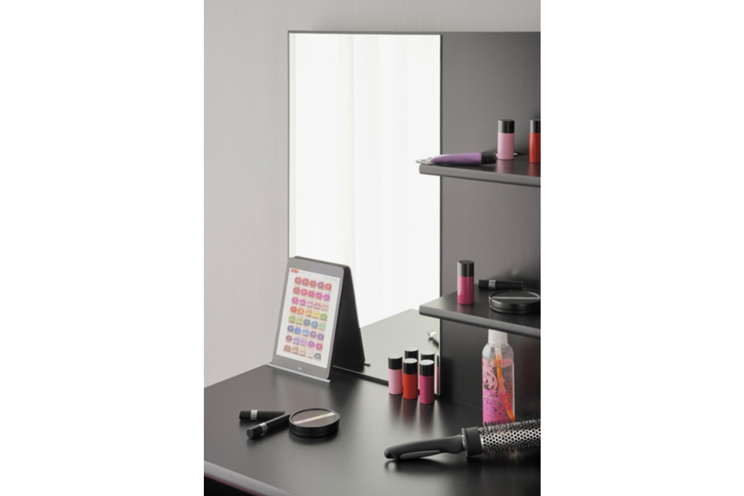 A convenient device holder supports your tablet or smartphone, perfect for practising new techniques while watching tutorials online. And of course, what would a vanity table be without a large mirror to ensure every detail results in a flawless look.