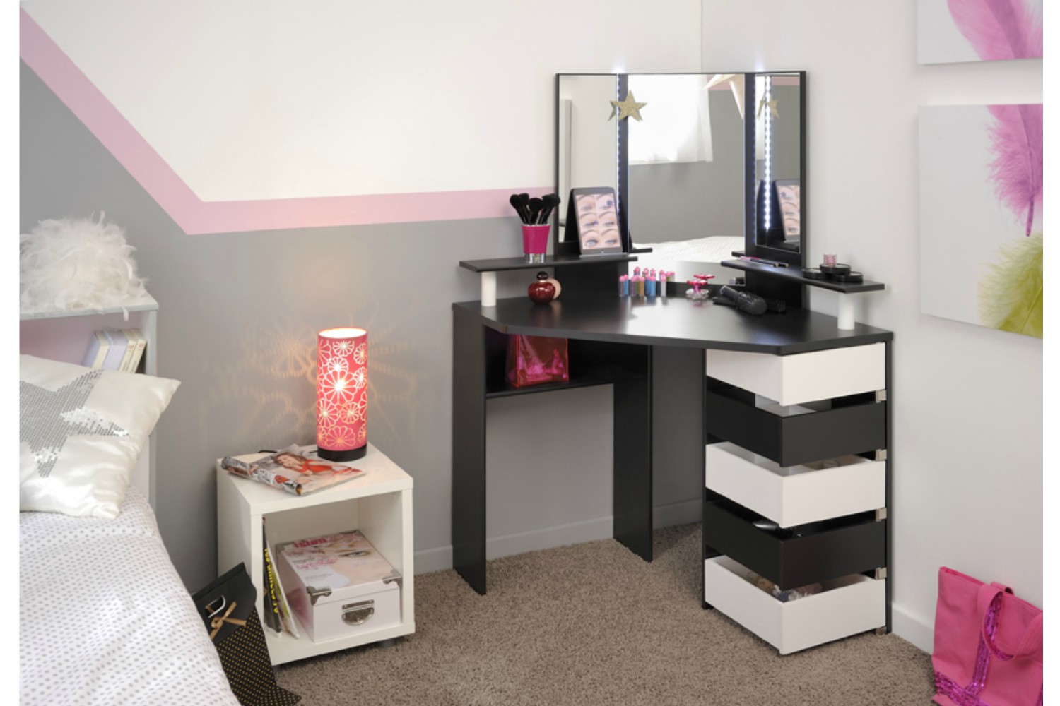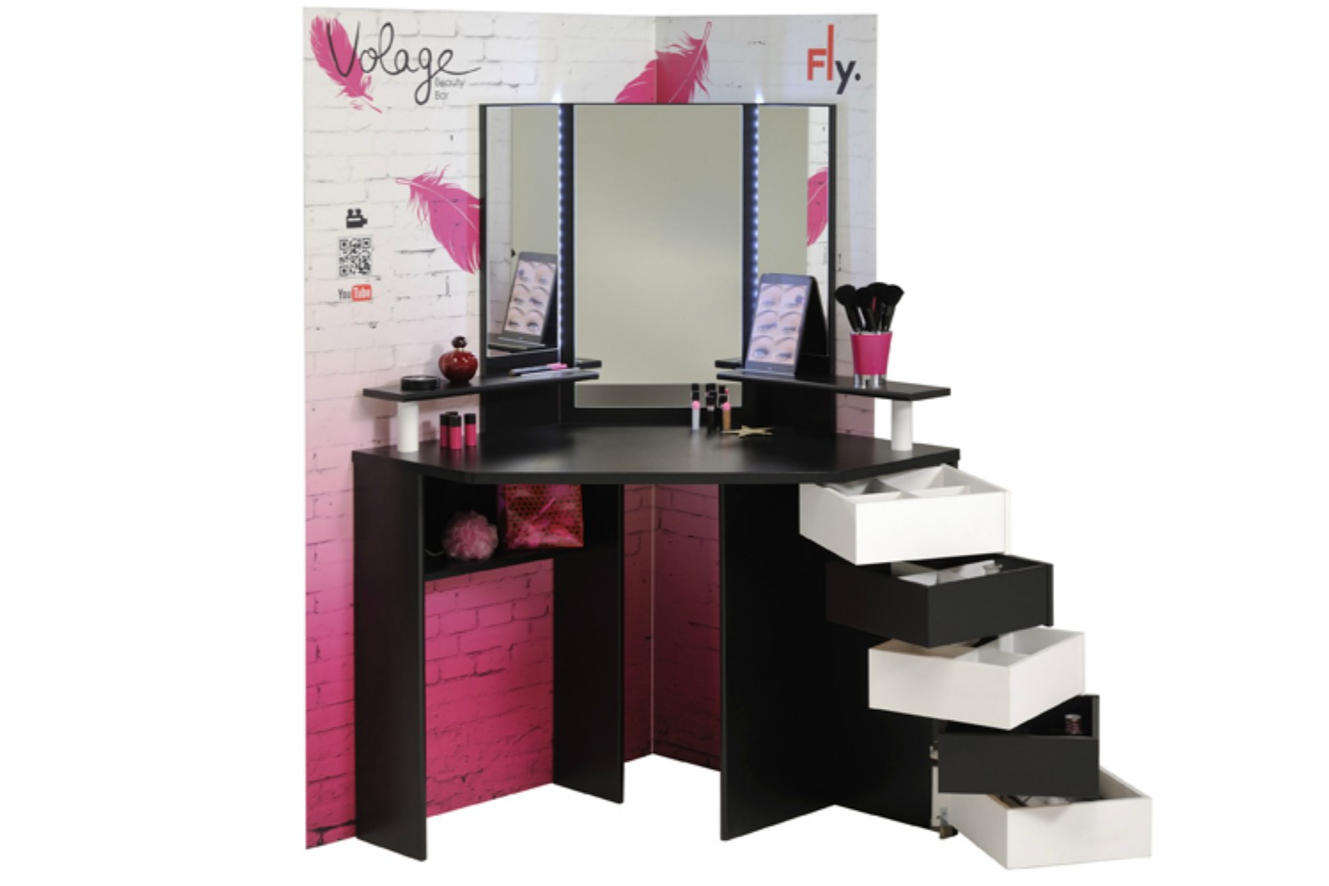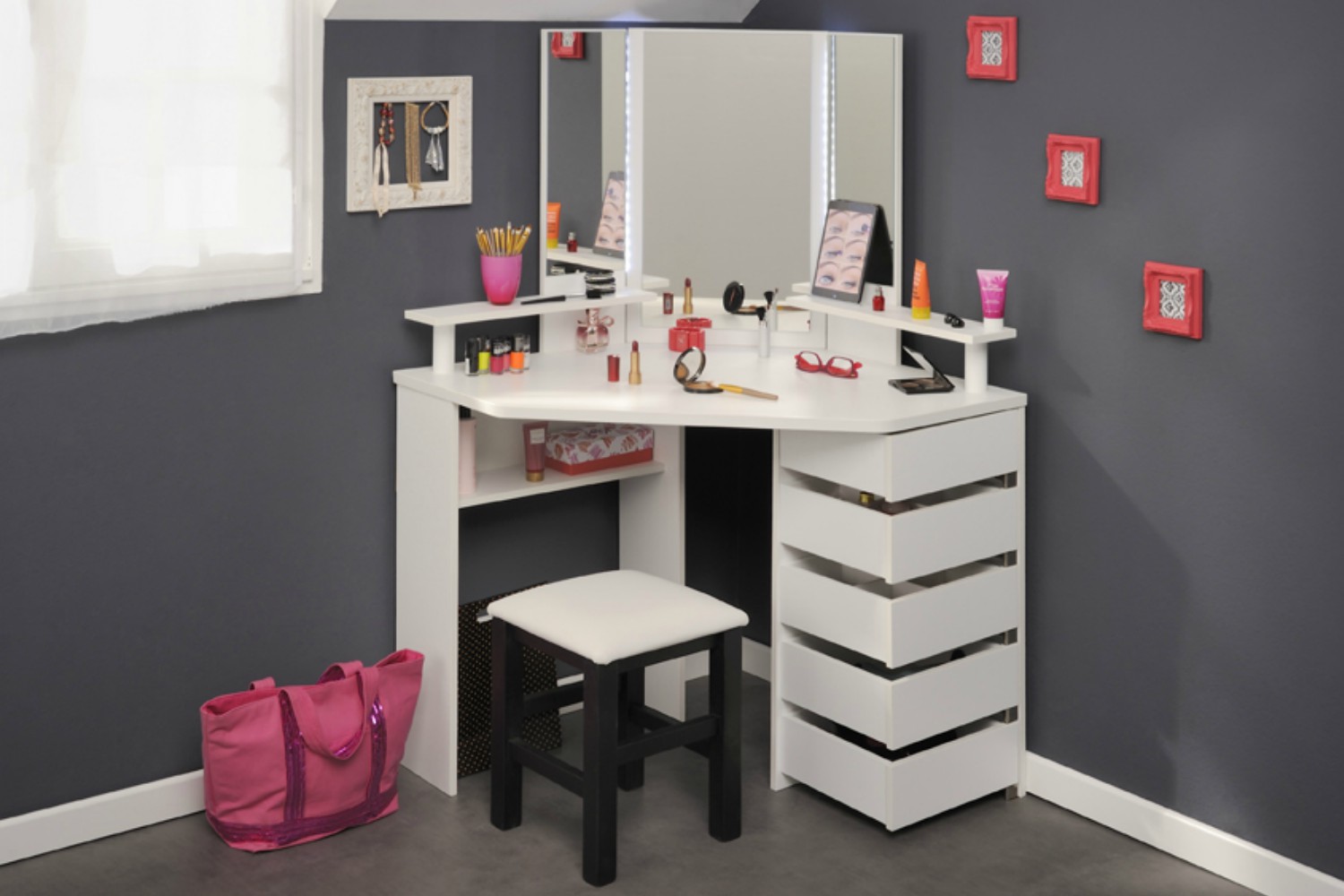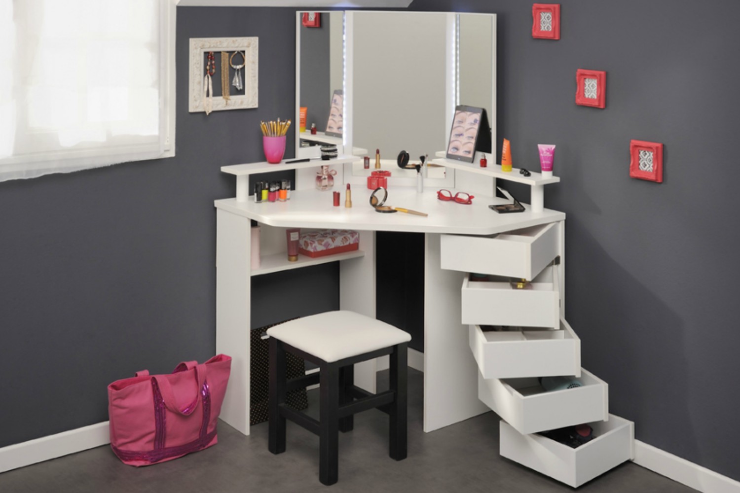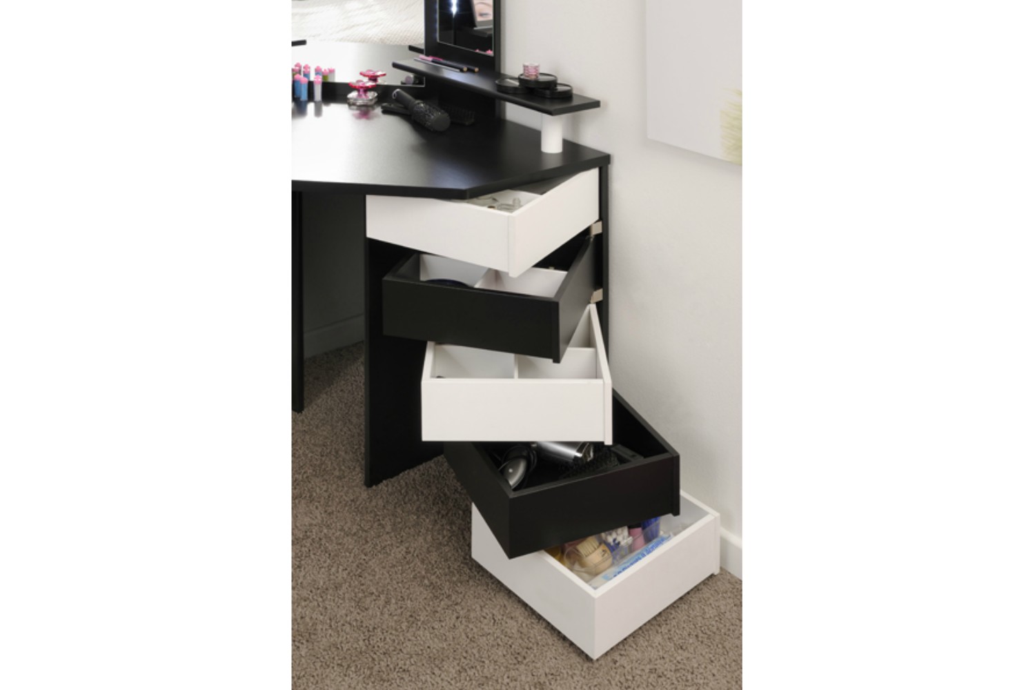 With 5 pivoting drawers, there is optimum storage space for all your beauty essentials, 3 of these are compartmentalised for organising smaller accessories like hair clips, jewellery or nail polish. An additional storage shelf underneath the counter provides more space to keep bulkier products out of sight.