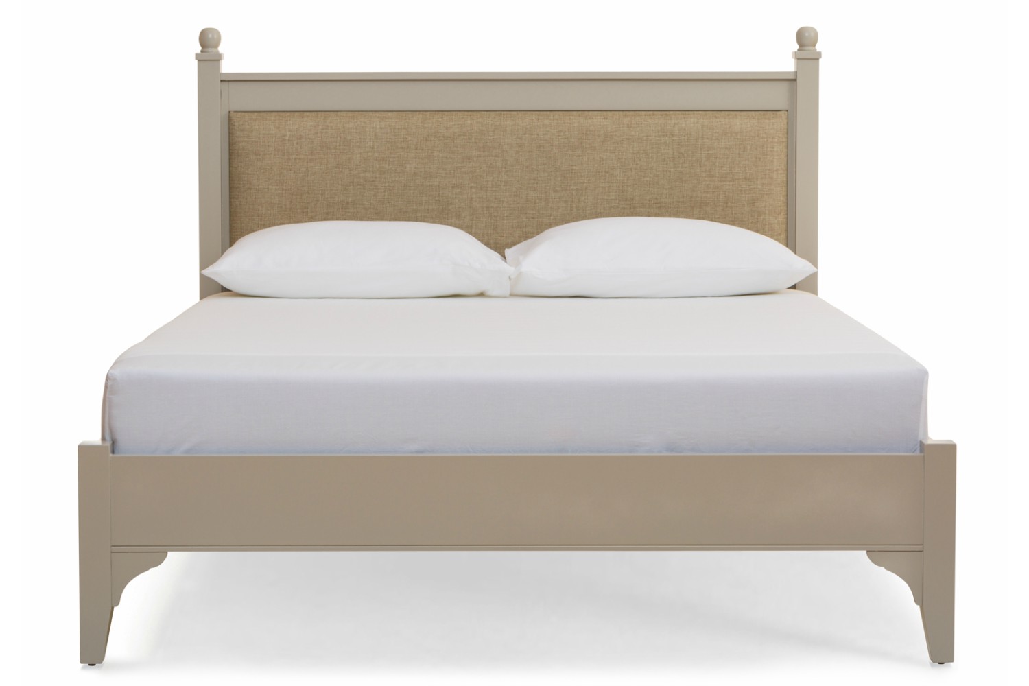 The Lynwood bed frame features a combination of wood and fabric for an elegant appeal. An upholstered rectangular section of the headboard softens the piece, while the sturdy posters are carved into spherical shape for a romantic finish.