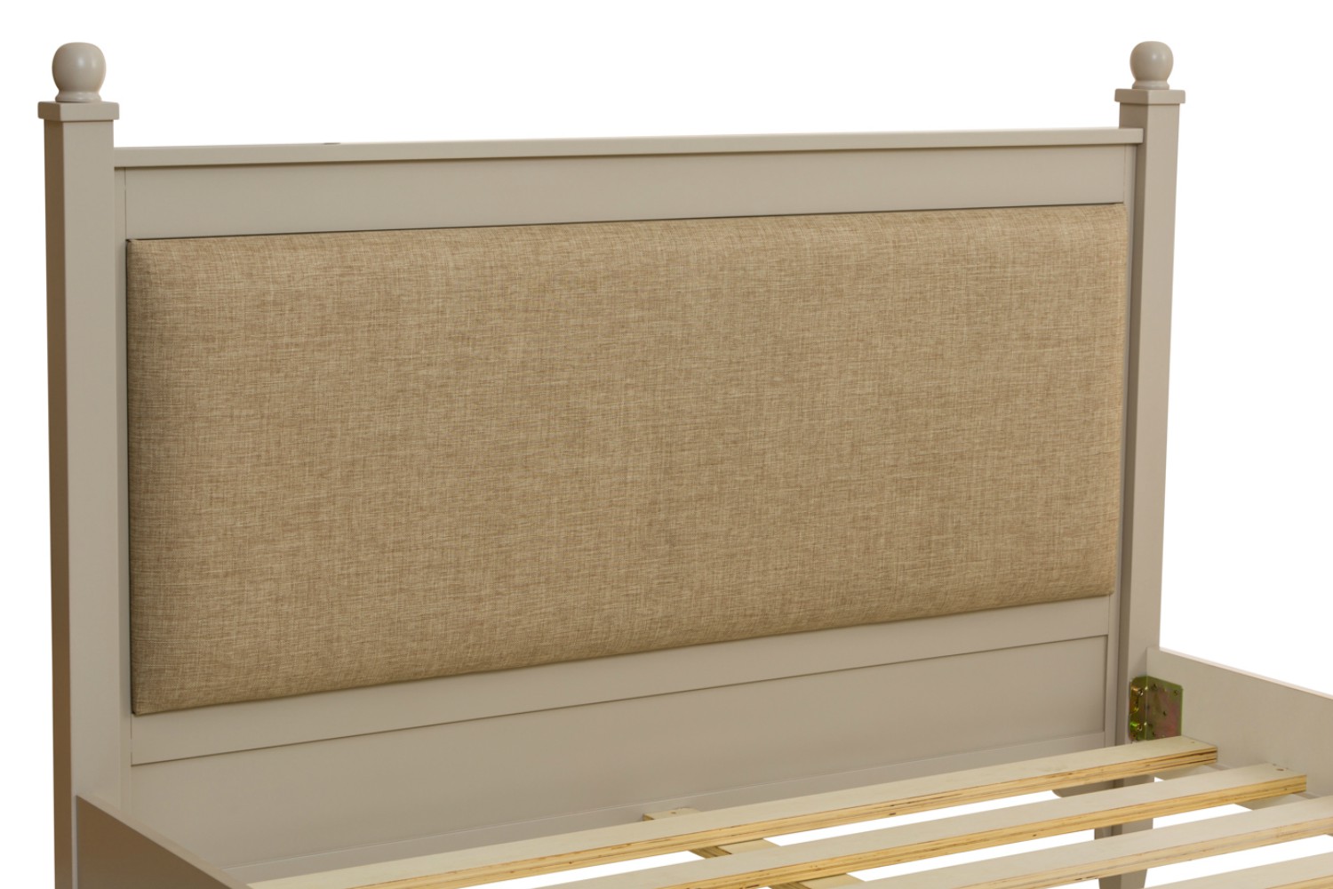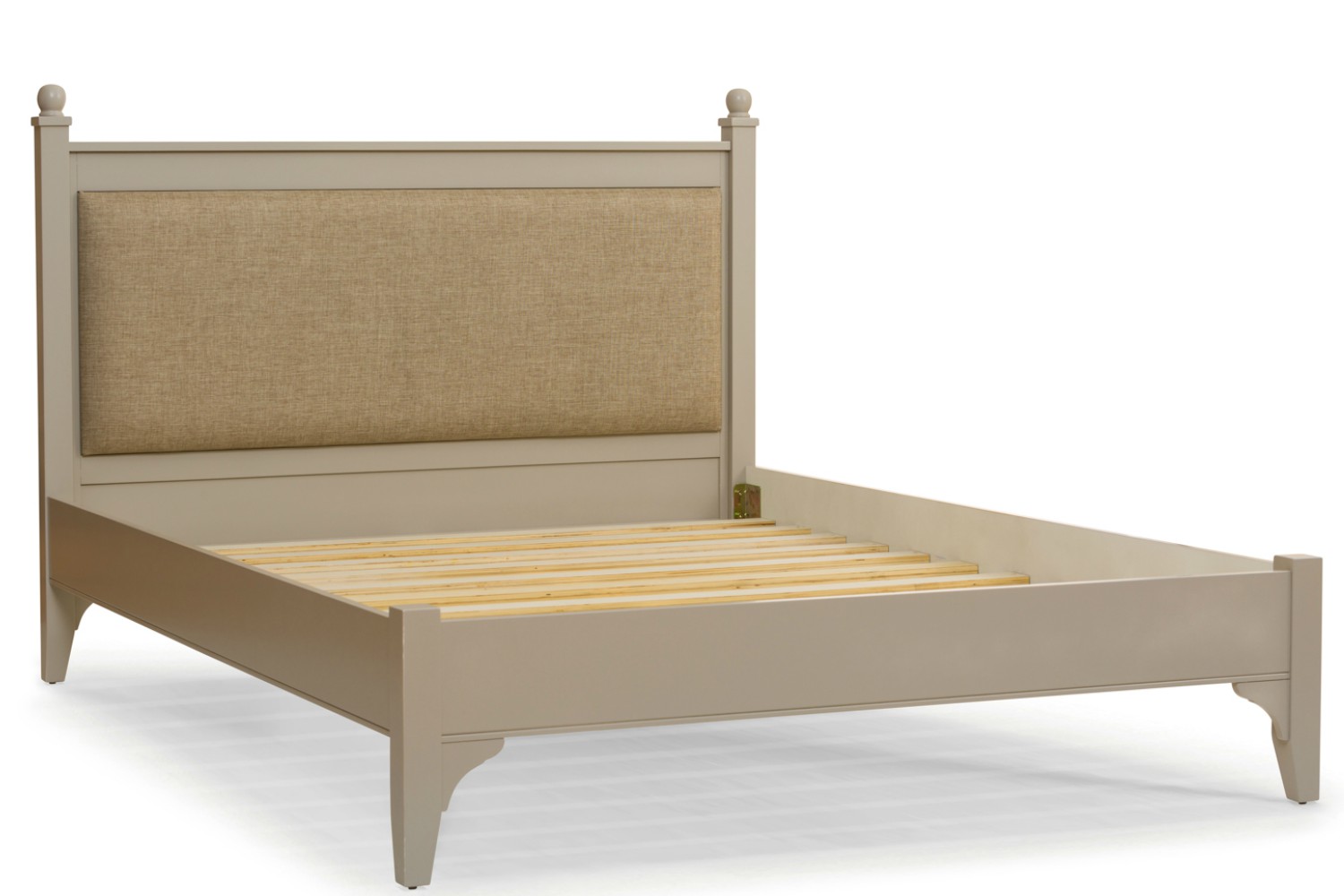 The Lynwood bed frame features a combination of wood and fabric for an elegant appeal. An upholstered rectangular section of the headboard softens the piece, while the sturdy posters are carved into spherical shape for a romantic finish.
