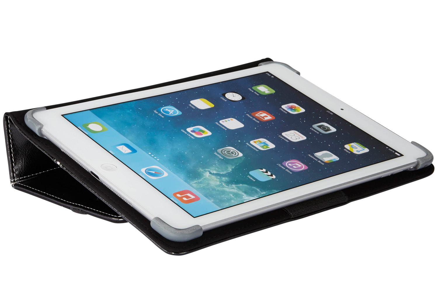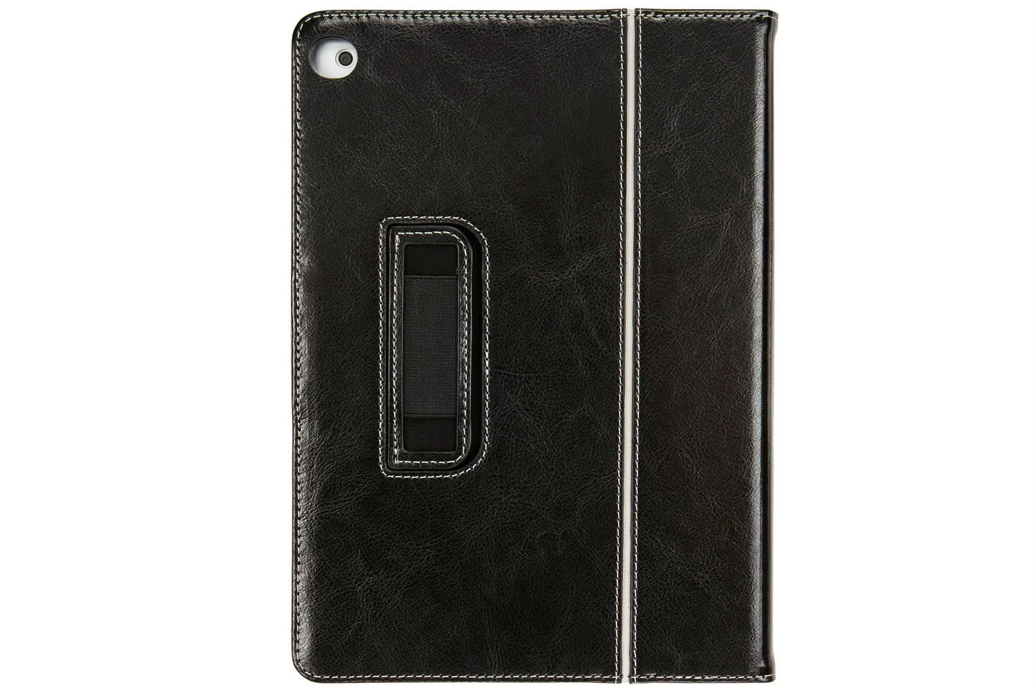 Enhance the protection and increase the functionality of your iPad Air 2 with our obsidian black premium leather with gray accent piping. With the clean, minimalistic design, you get all the protection you need without losing access to any buttons, jacks or the light sensor. Our SG Bumper Technology securely protects your iPad Air 2 and lets you change it out in seconds. Serves as a low angle prop for great comfort in typing mode, or as an upright stand to sit back and watch movies and video clips. The camera cut out is perfect for taking photos and recording video. It's simply our best iPad case, just for your Air 2.