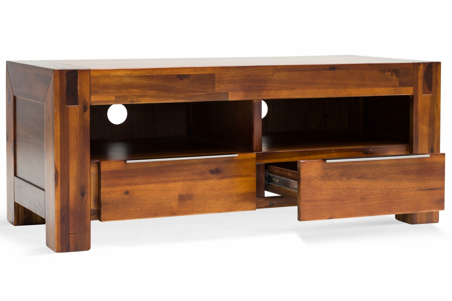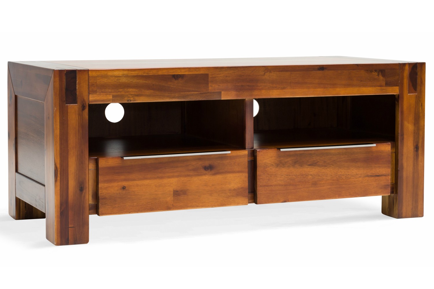Complete your living room with the Orient TV unit, a beautifully crafted acacia wood piece for premium entertainment viewing. Two large spaces can hold a satellite box, streaming player or games console with a space in the back panel to keep wires and leads neat and out of view. Two drawers provide additional storage with silver tab handles for minimal modern detailing.