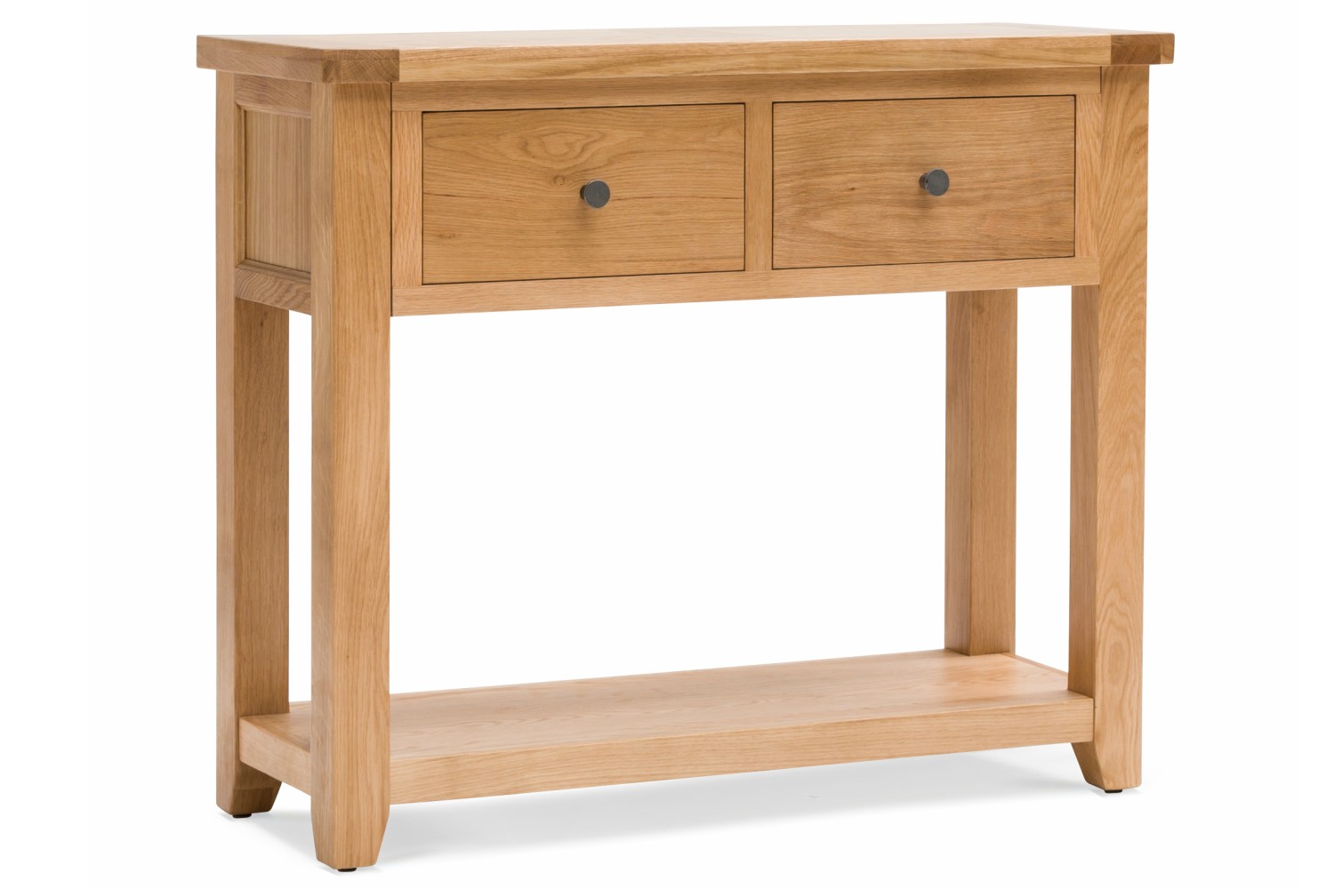 Make the most of your space with the Hillary console table, a wonderfully compact piece with multiple storage options. The Hillary can slot right into your living room, kitchen or even hallway boasting an attractive country vibe. Two drawers provide additional storage while the conical shaped handles add contrast to the authentic wood finish. A lower level shelf allows you to keep larger items out of the way.