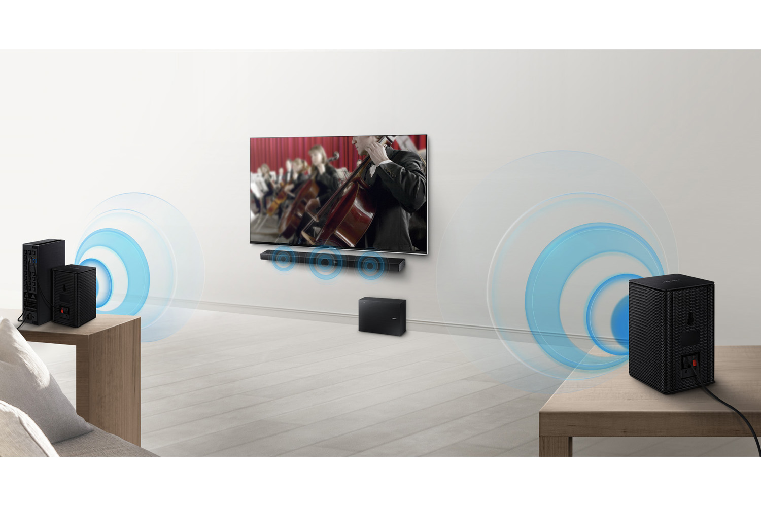 Bump up the level of audio in your TV room with the SWA-8000S rear wireless speaker kit from Samsung. Turn your current soundbar set up into a next level surround sound dynamic experience. Simply connect the rear speakers to the current soundbar and you have audio from all angles. What's more, they are wireless so there's no wires to route to the front of the room. Experience more powerful surround sound now!