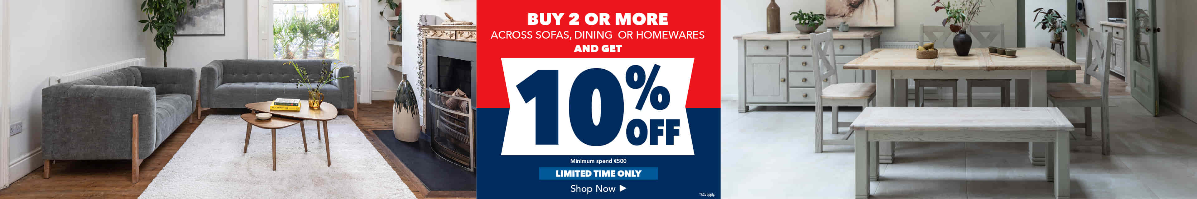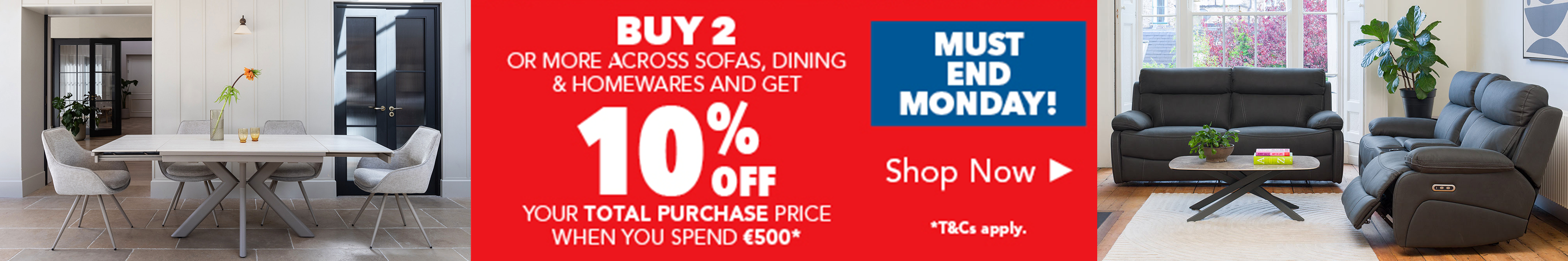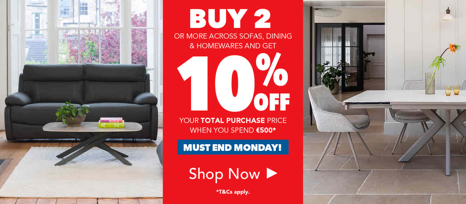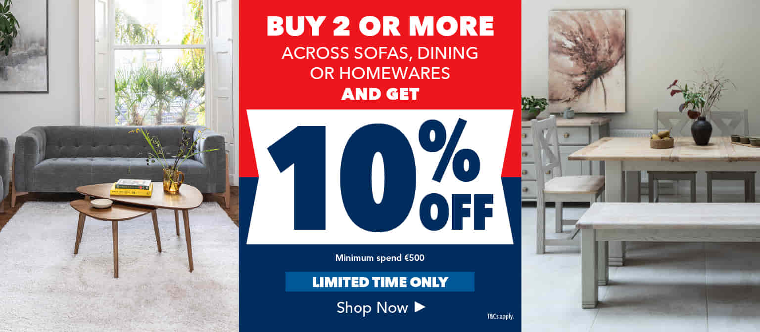 Refresh Your Home & Save Big! Upgrade your space with sofas, dining furniture, and selected homewares—and enjoy 10% Off when you buy 2 or more items and spend €500 or more. Perfect for creating the home you love, at a price you’ll love even more!