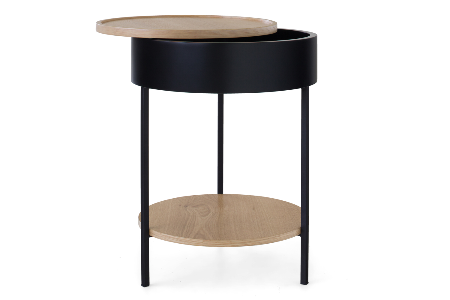 Add a touch of modern elegance to your bedroom with the Hazel Round Bedside Table. This stylish piece features a storage compartment, perfect for keeping your nighttime essentials neatly tucked away, and a convenient shelf underneath, offering additional space for books, decor or personal items. The circular design brings a soft, inviting feel to your space, while the mix of black and natural wood provides a contemporary yet warm aesthetic that complements a variety of interior styles.