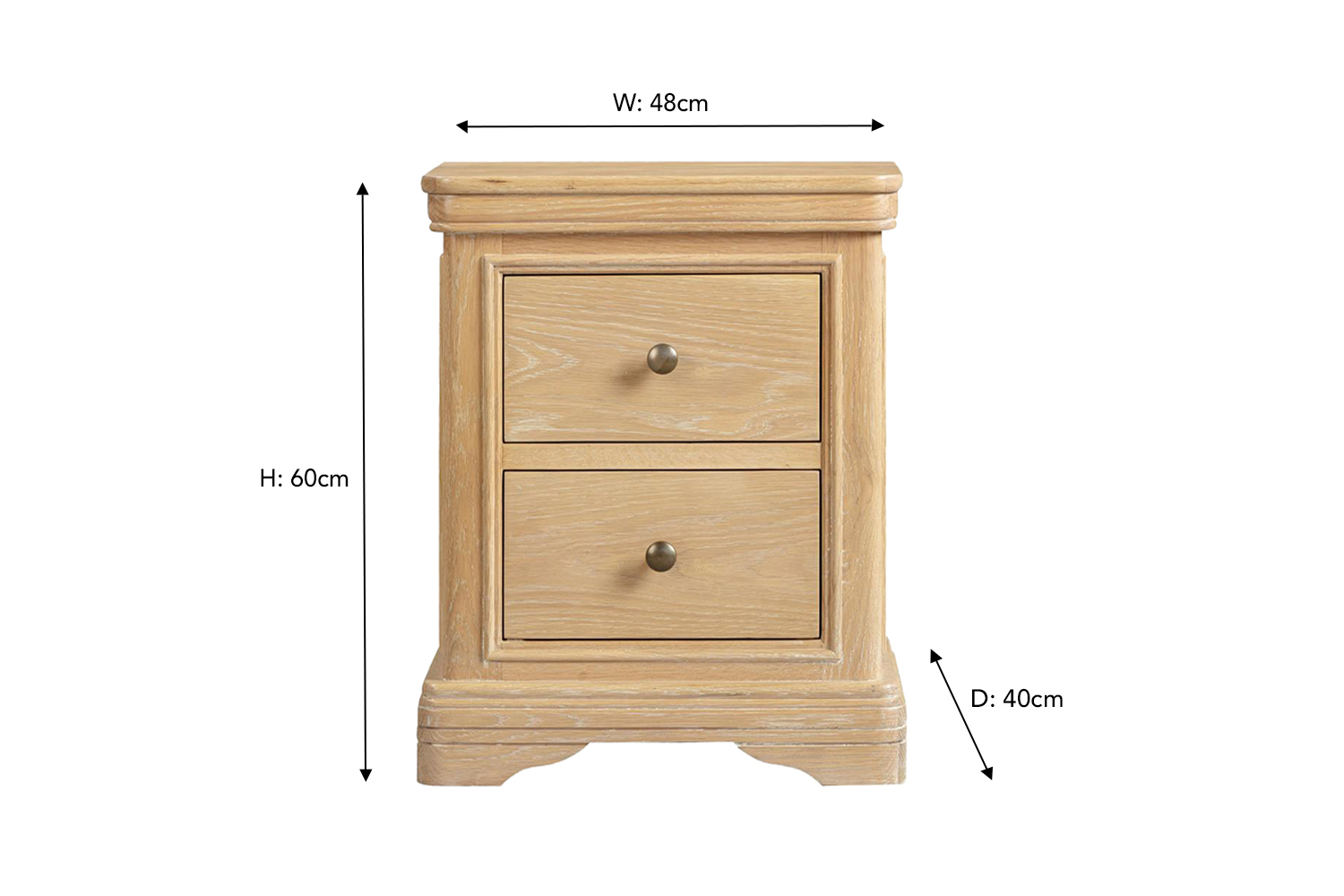Made from solid oak wood, the Montreal bedside locker will bring an organic feel to your sleep space. Its natural finish showcases the woods natural grain and knots that give this piece character and radiates comfort. Boasting a classic design this locker evokes a feeling of warmth thanks to its traditional shape and style. It features two spacious drawers ideal for storing your bedside essentials in an easy to reach place. The tabletop provides ample space for a table lamp, some books, and your phone. It is made complete with gold metal handles that really tie this piece together.