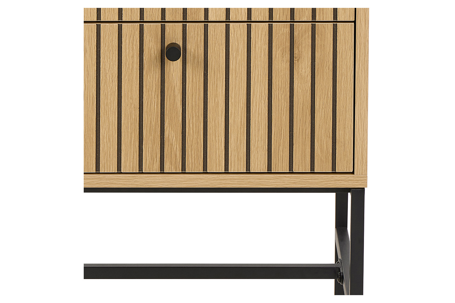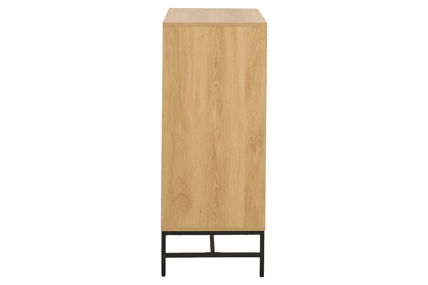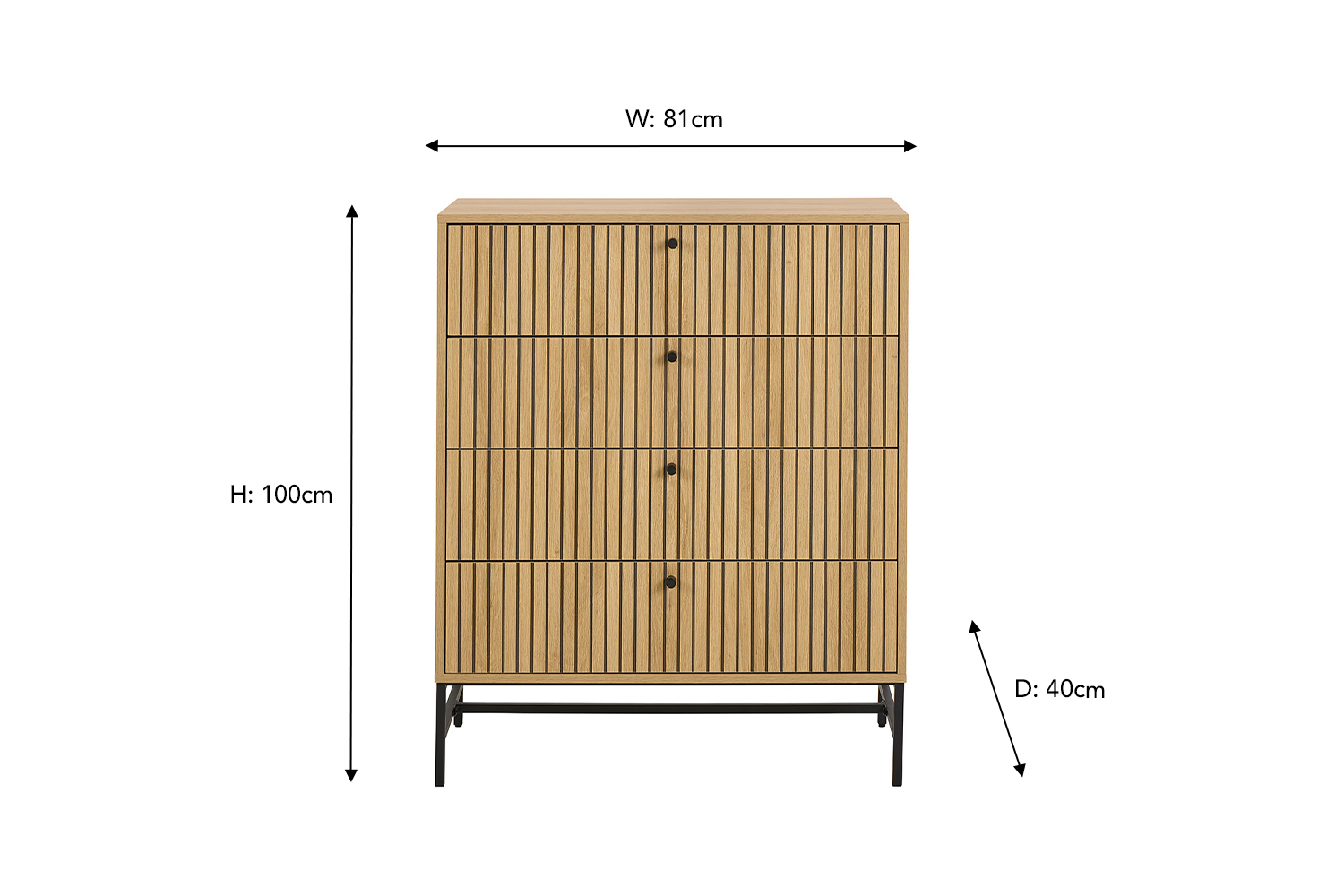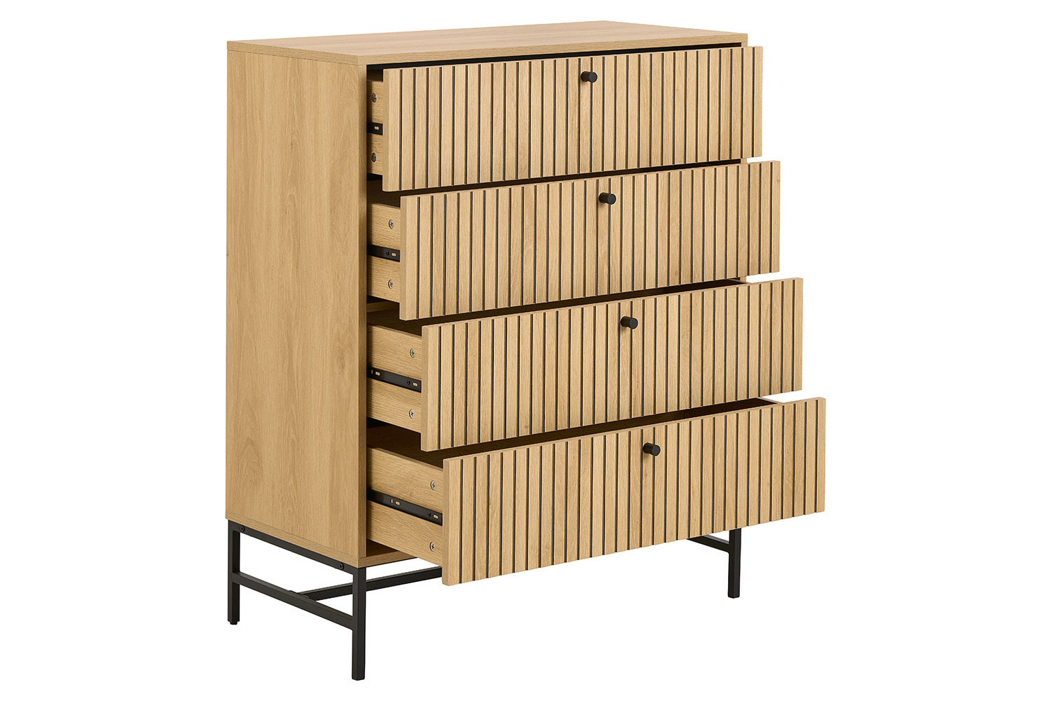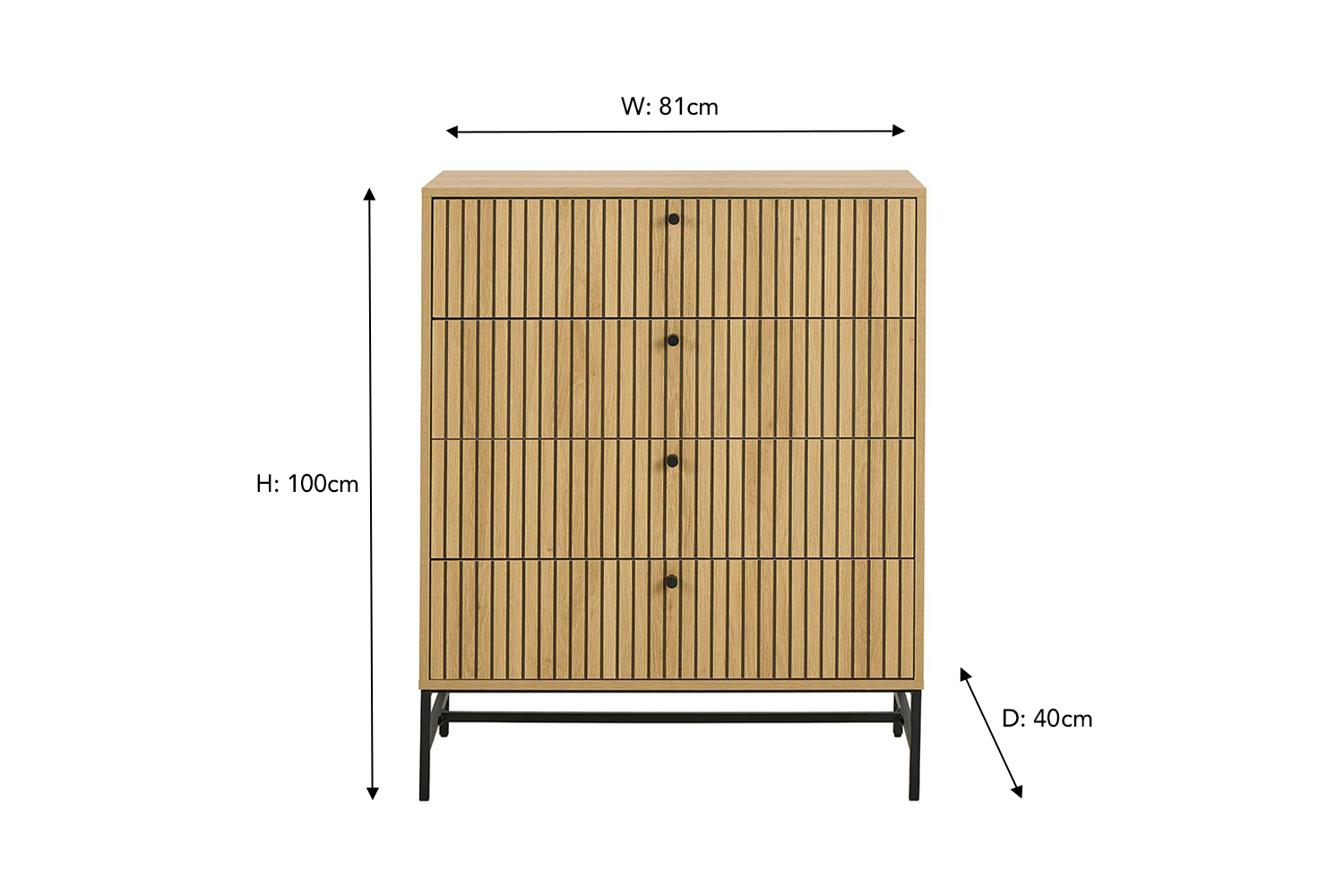 Elevate your space with the Albany chest of drawers, where clean lines meet natural warmth. This design features a sleek, linear slatted front that adds texture and visual interest. While the black metal legs and minimalist handles lend a modern industrial edge, offering a striking contrast to the organic tones of the wood. With four spacious drawers for all your storage needs, this piece blends function and style effortlessly, perfect for bedrooms, entryways, or living spaces with a modern aesthetic.