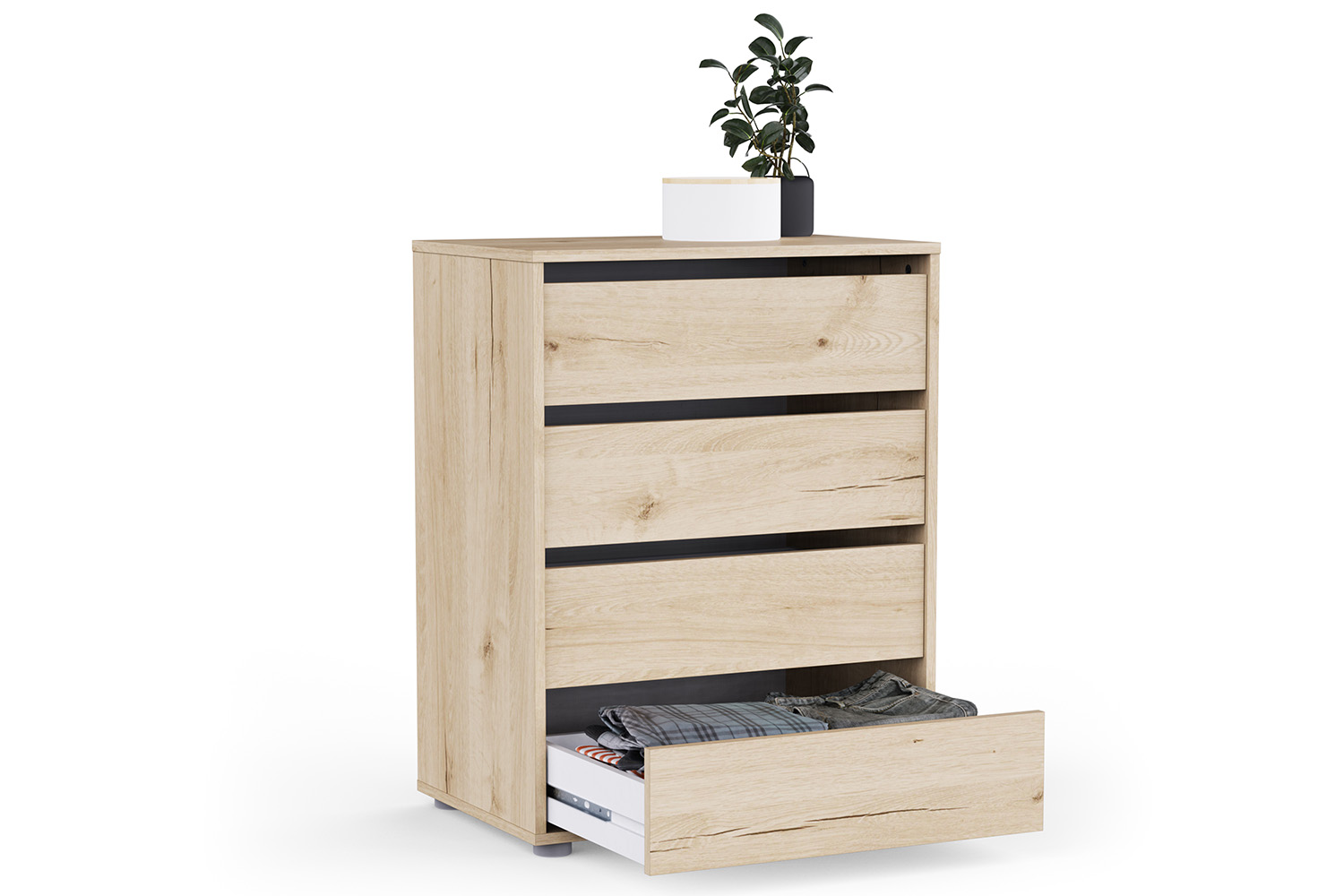 With four spacious drawers, this chest offers ample storage to keep your essentials neatly tucked away. Whether you’re furnishing a cozy bedroom or a modern living area, its understated look blends effortlessly with a variety of décor styles. It’s available in two different sizes and colours, so you’re sure to find the right fit for you.