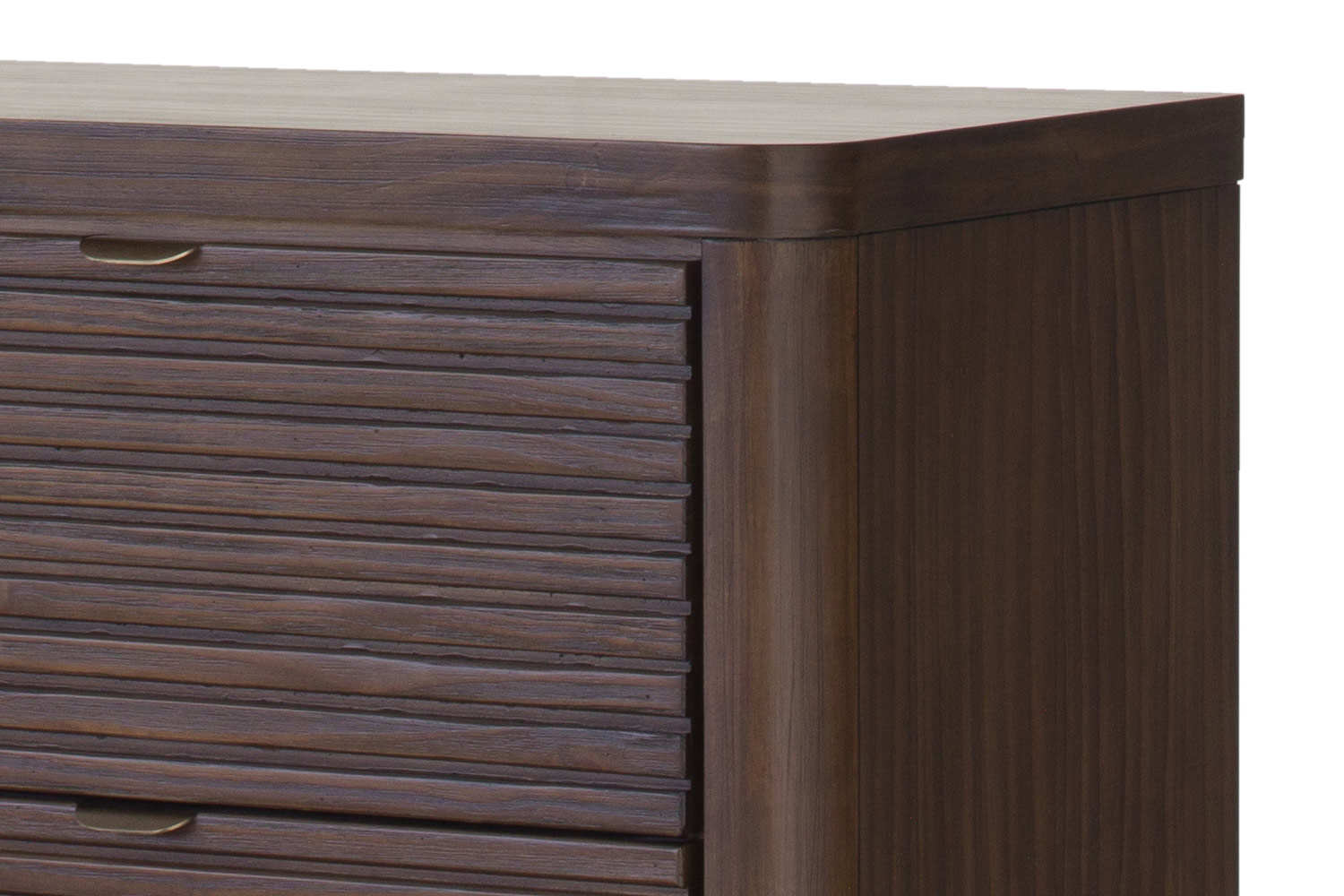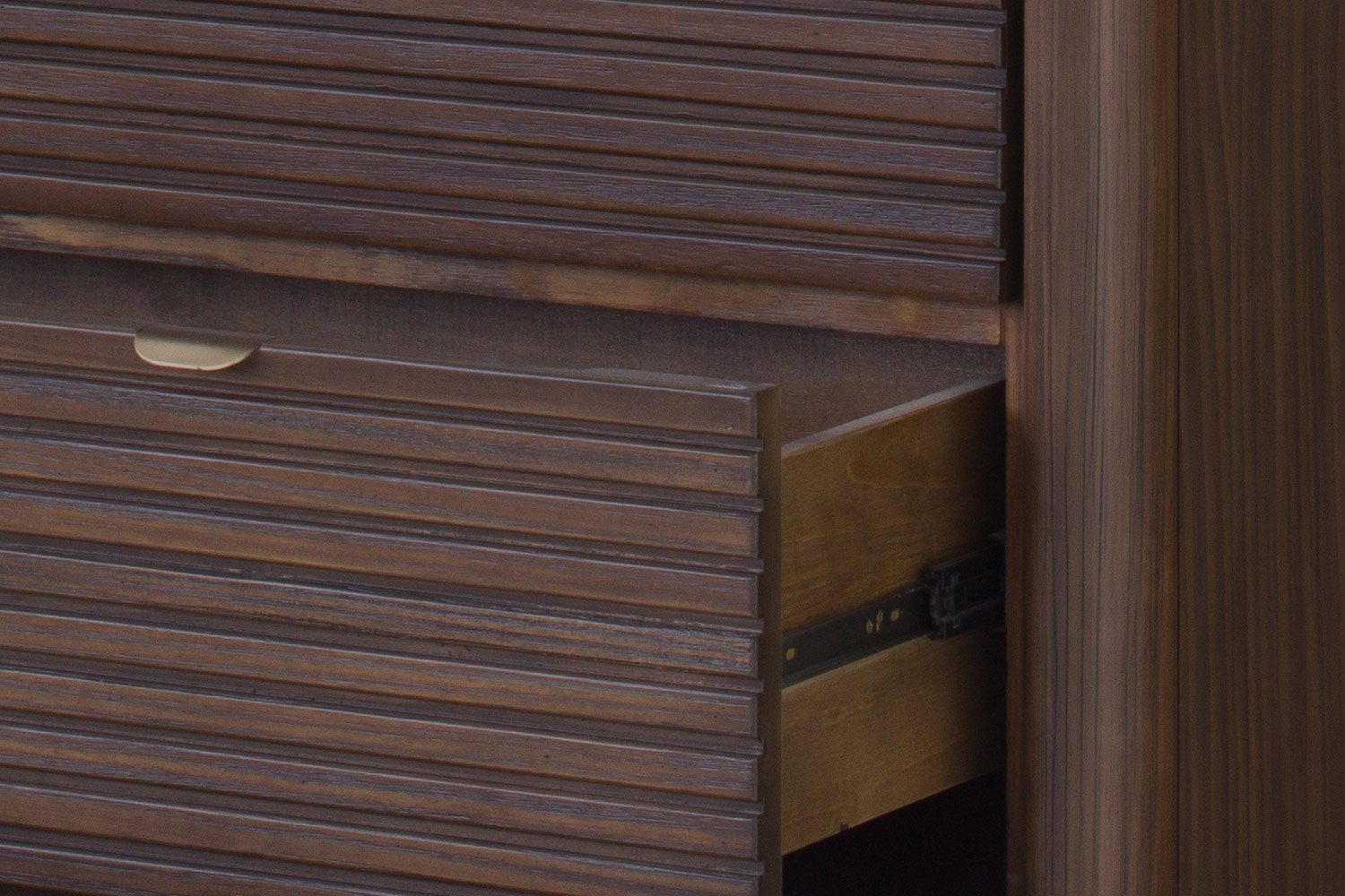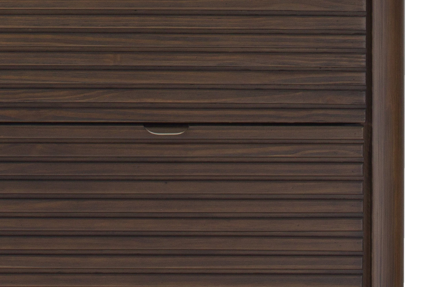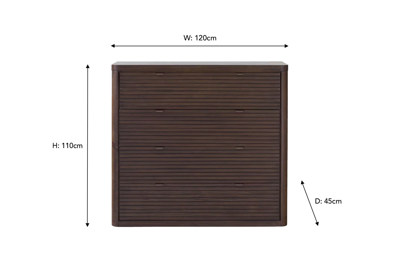 Made from wood in a stunning deep brown hue, the Brunswick chest of drawers exudes warmth and comfort. Designed to be a focal point of your bedroom for years to come, this chest ensures longevity with its wooden frame and includes a sleek metal handle. It features a carved linear design in the that radiates a refined design and gives this piece a contemporary look. With four large drawers and a spacious tabletop, you can store all your clothing essentials in a stylish and easy to reach place. The tabletop gives you ample room to showcase your favourite decorative pieces, a table lamp, or some books.