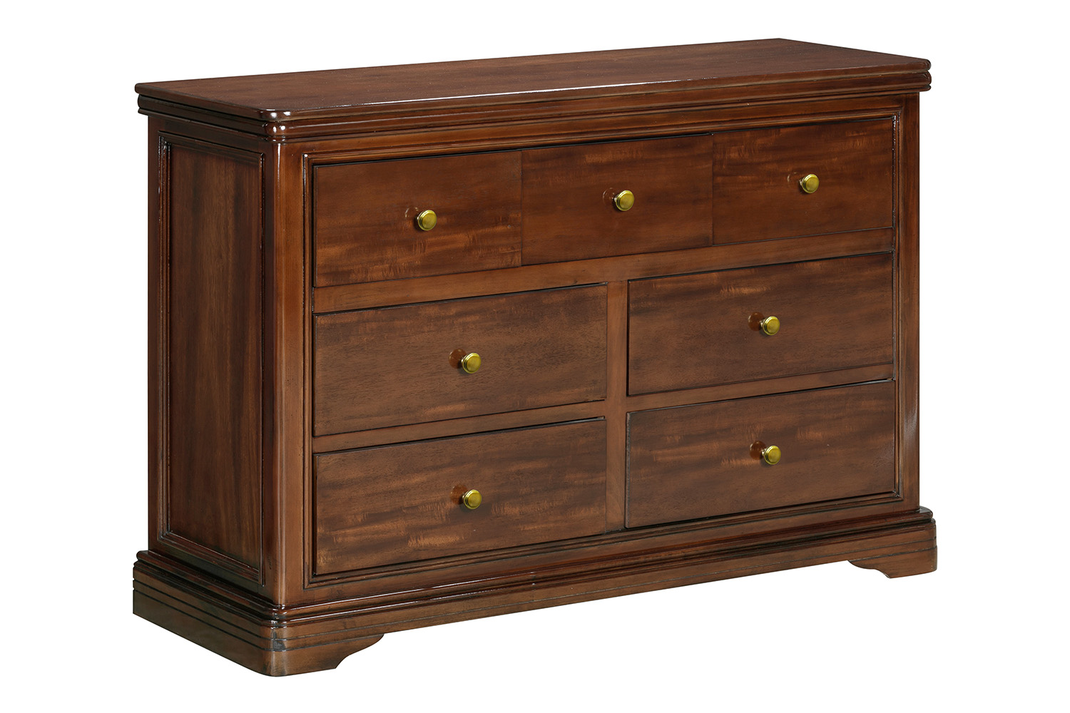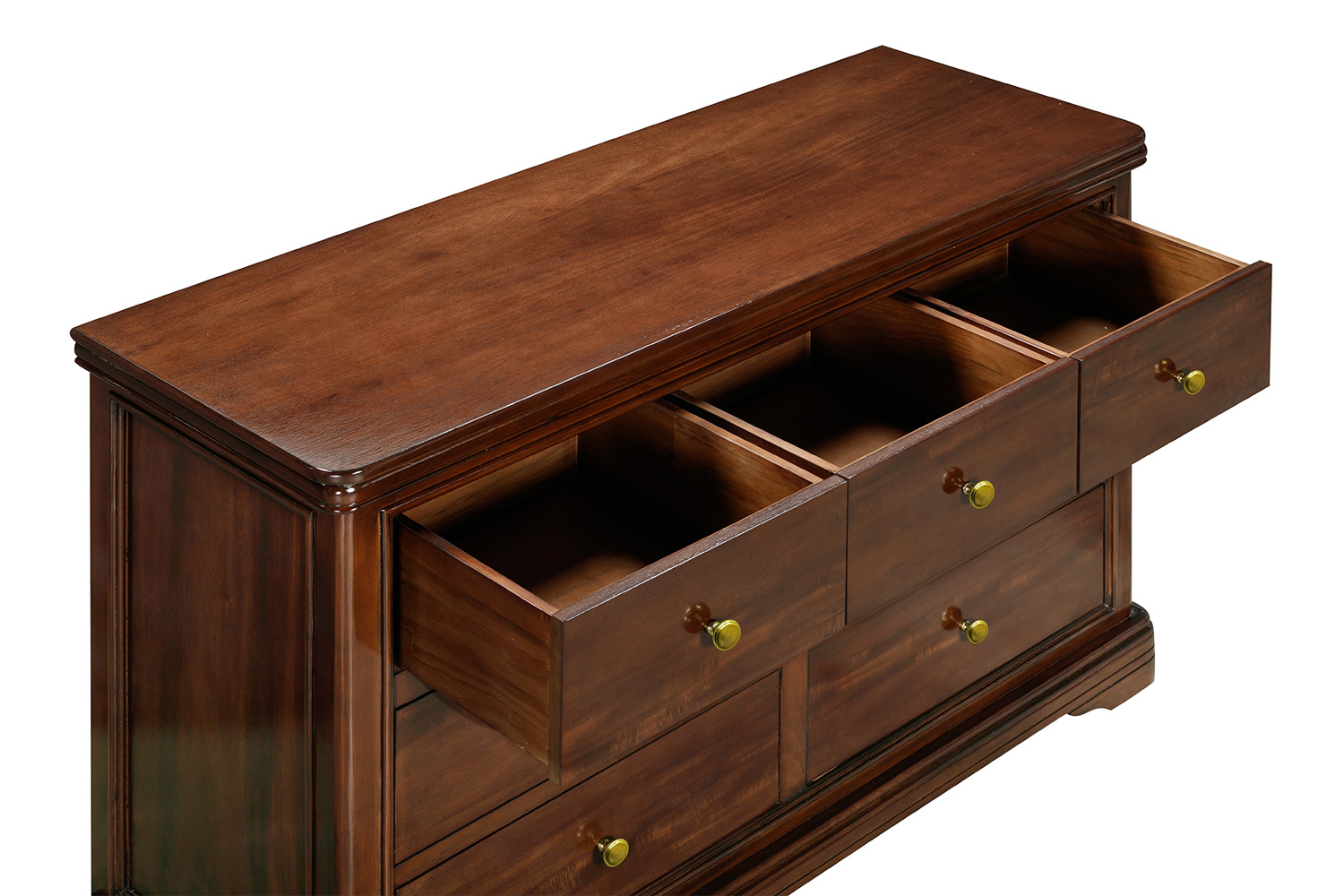 Built for comfort and long-lasting durability, the Deauville dresser is the perfect mix of elegance and functionality for your home. Crafted from stained hardwood and Acajen veneer in a deep brown hue, it radiates both a warm and refined feel into your bedroom. The stunning lacquered finish not only enhances the natural beauty of the wood grain but also makes for a practical and hardwearing finish. It’s complete with the complementing gold metal handles and includes three small, and four large drawers perfect for storing all your clothing essentials. Give your bedroom the ageless opulence it deserves with the Deauville dresser.