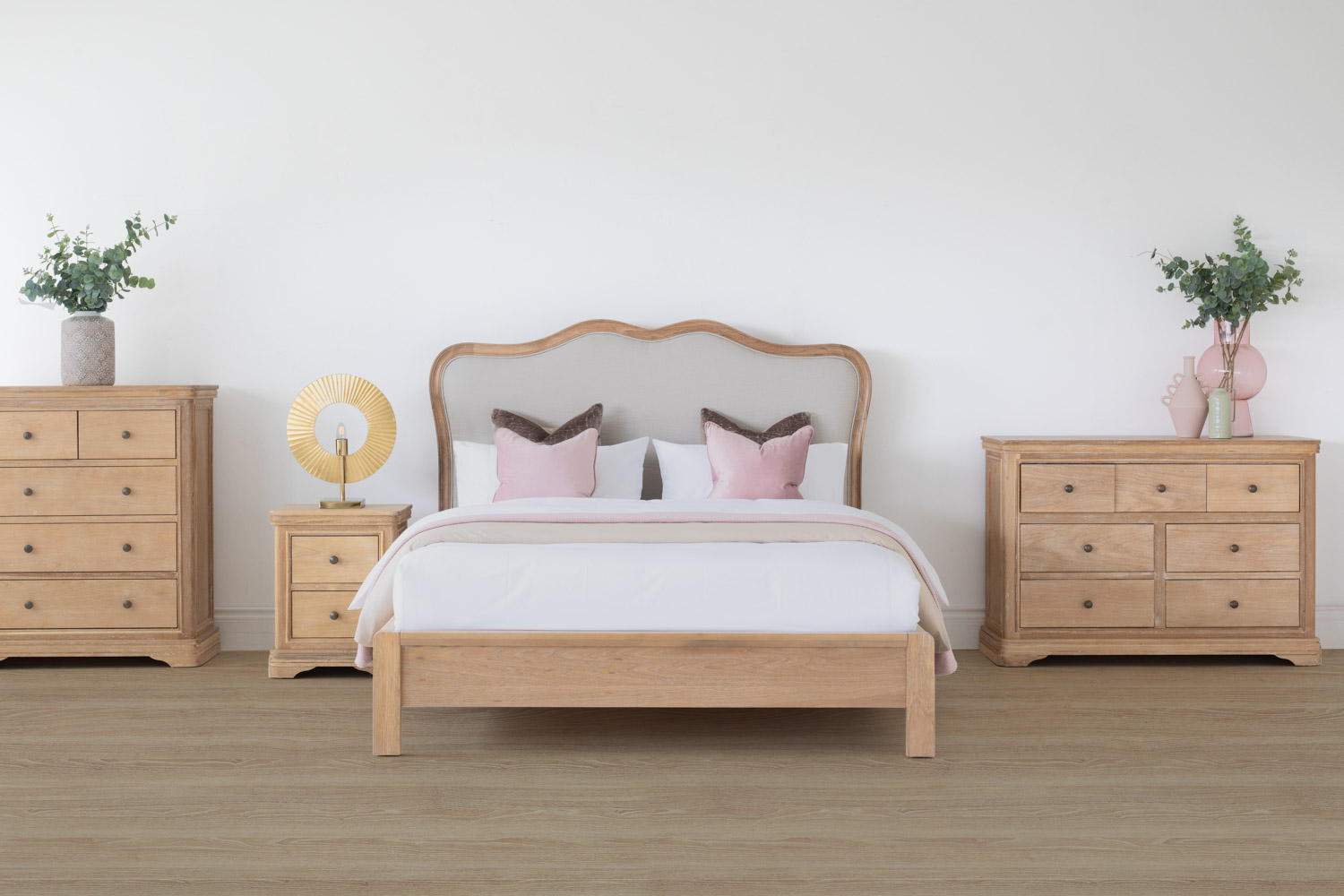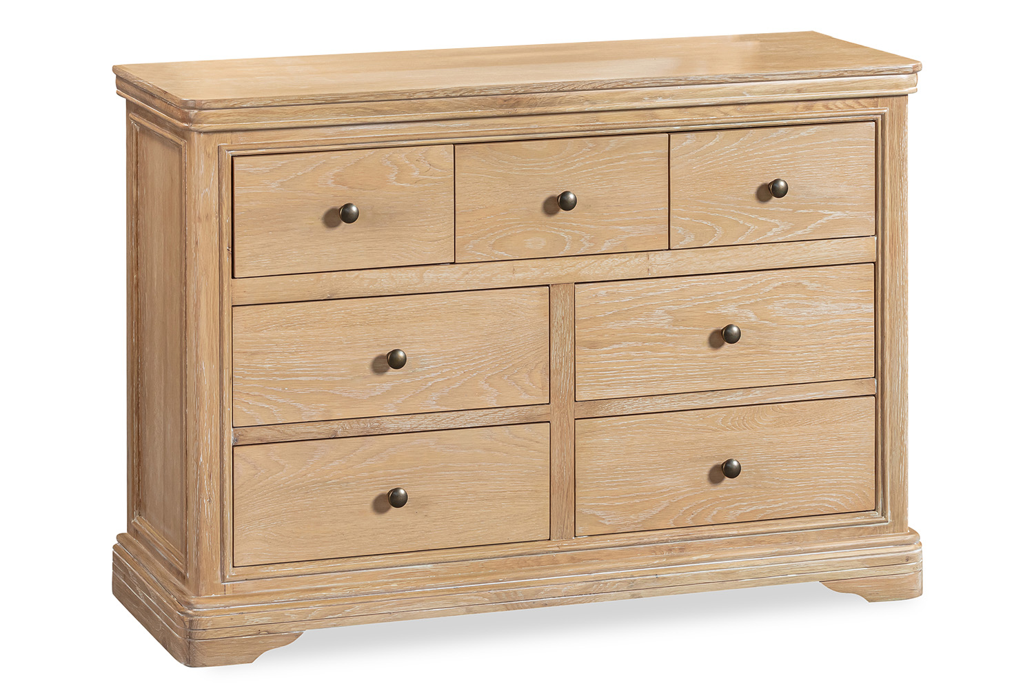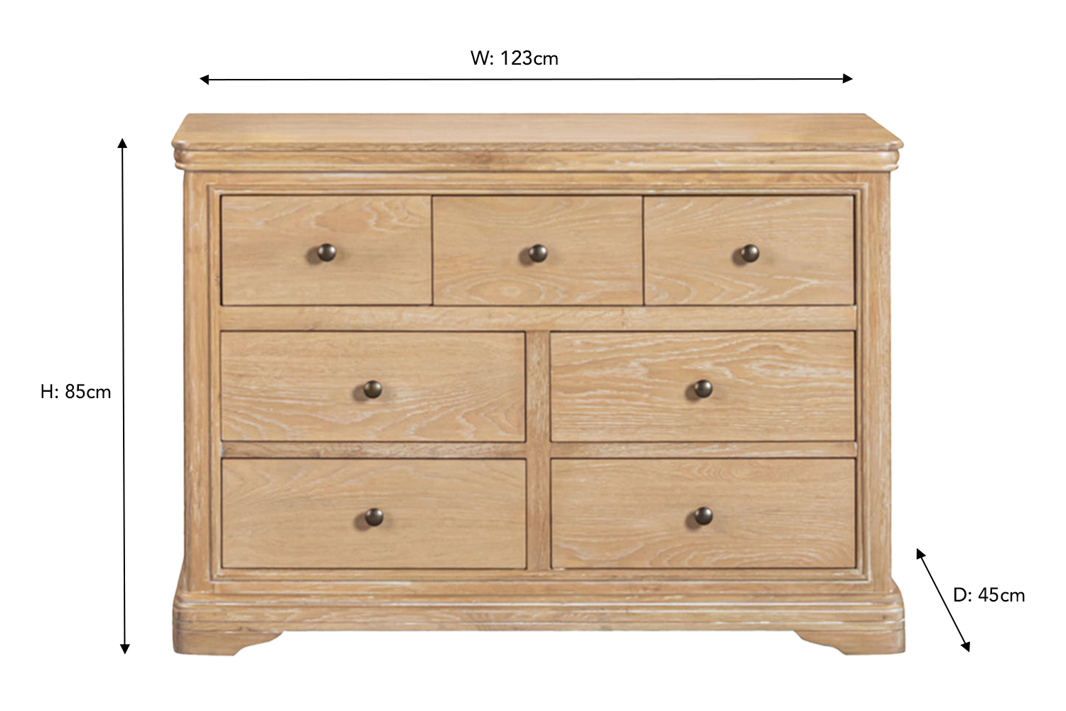 Made from solid oak wood, the Montreal dresser will bring an organic feel to your sleep space. Its natural finish showcases the woods natural grain and knots that give this piece character and radiates comfort. Boasting a classic design this dresser evokes a feeling of warmth thanks to its traditional shape and style. It features three small drawers and four large drawers ideal for storing all your clothing and accessory essentials in an easy to reach place. The tabletop provides ample space for a table lamp, some books, and your phone. It is made complete with gold metal handles that really tie this piece together.