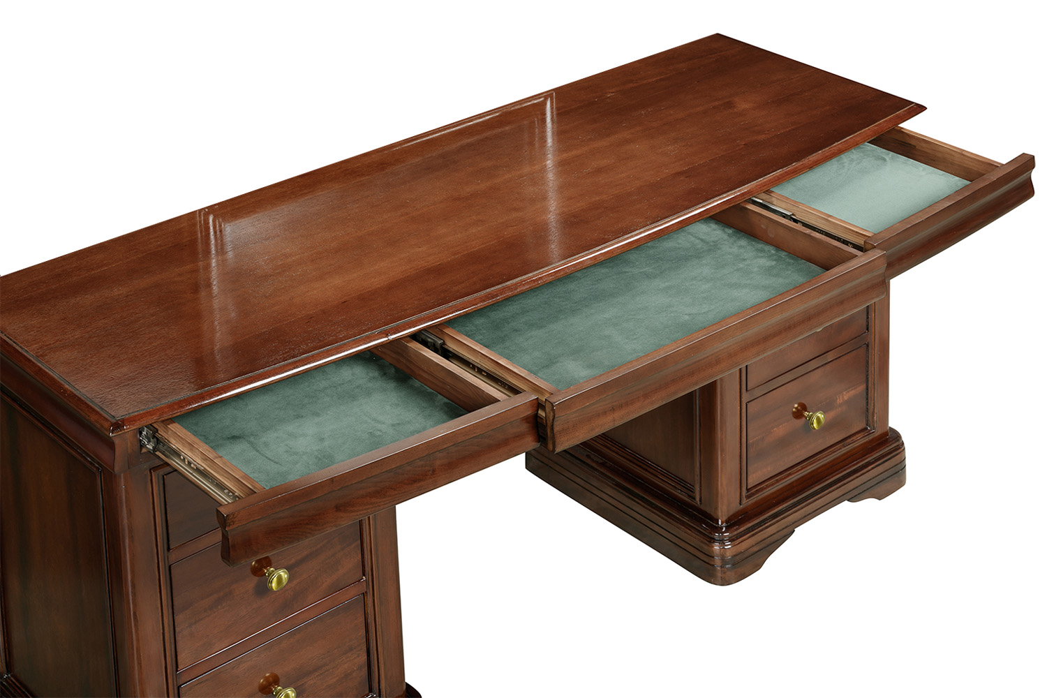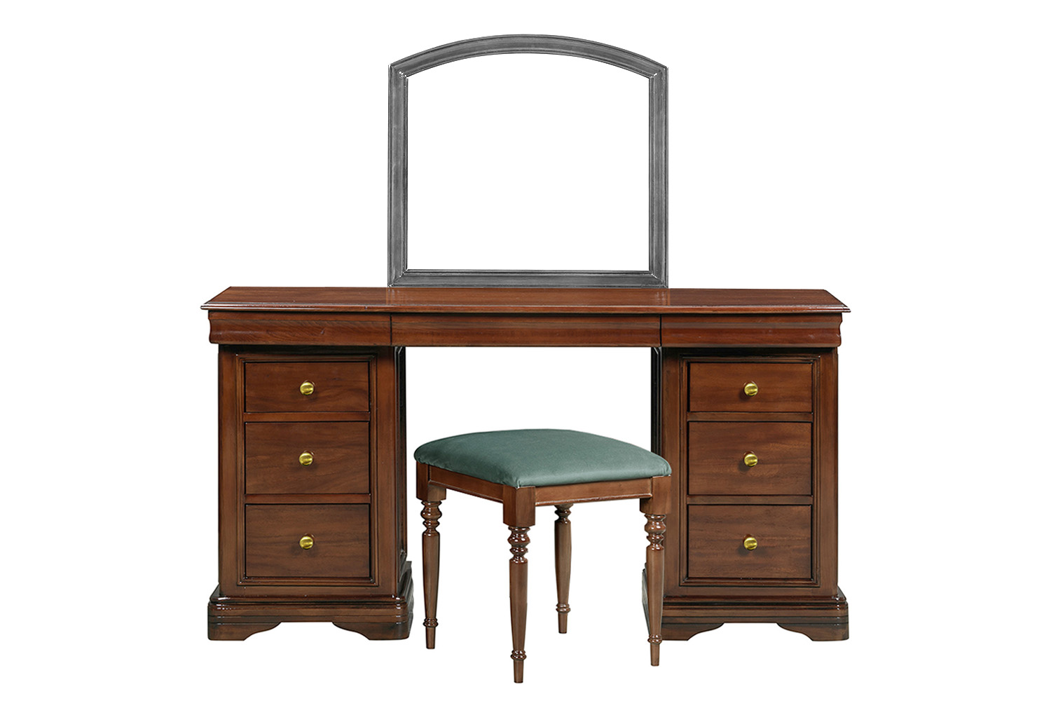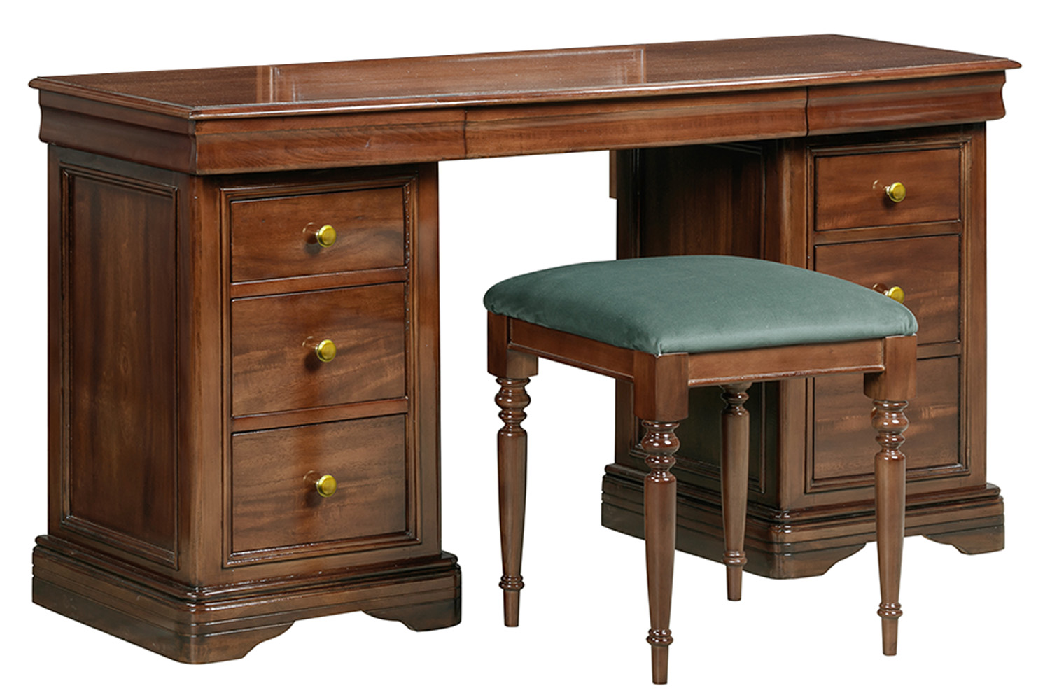 Built for comfort and long-lasting durability, the Deauville vanity unit with stool is the perfect mix of elegance and functionality for your home. Crafted from stained hardwood and Hardwood and Acajen veneer in a deep brown hue, it radiates both a warm and refined feel into your bedroom. The stunning lacquered finish not only enhances the natural beauty of the wood grain but also makes for a practical and hardwearing finish. It’s complete with the complementing gold metal handles. Versatile and beautiful, this vanity unit includes four drawers that can be used to store all your essentials in an easily organised place. It includes a matching stool with padded seat for comfort. Give your bedroom the ageless opulence it deserves with the Deauville dresser.