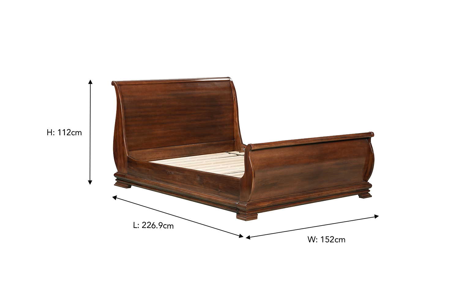 The Deauville bedframe features a dramatic headboard and impressively styled sleigh frame with elegantly rolled foot and headboards. The stunning lacquered finish not only enhances the natural beauty of the wood grain but also makes for a practical and hardwearing finish. Built for comfort and long-lasting durability, this bed frame is the perfect mix of elegance and functionality for your home thanks to the hardwood and wooden slatted base. Give your bedroom the ageless opulence it deserves with the Deauville bedframe.