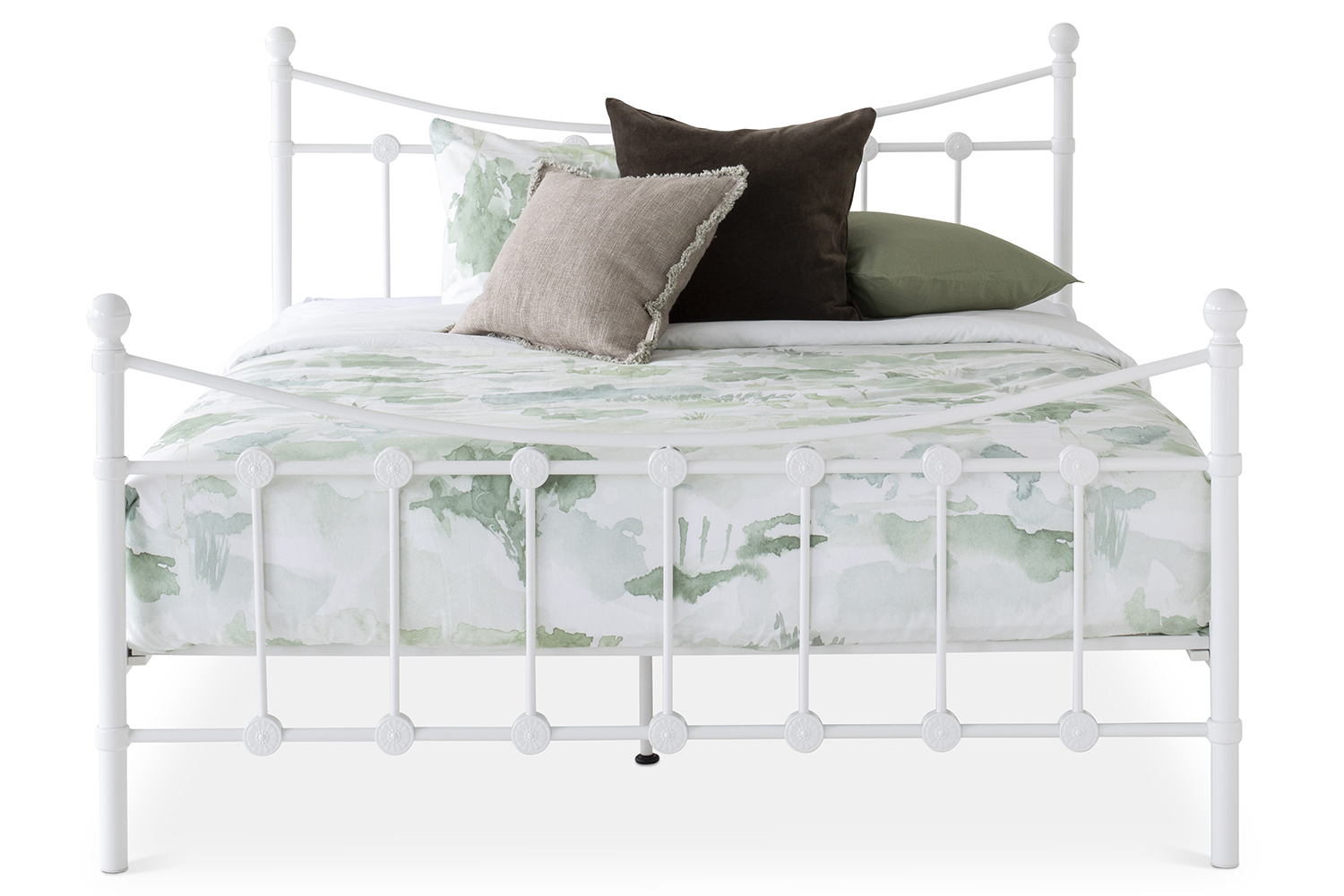 Made entirely from a durable metal, this bed will stand the test of time. The headboard and footboard feature a classic straight frame metalwork with a curved top. The open space underneath allows for storage space, perfect for smaller or more compact rooms. The bedframe is completed with a white hand painted finish. Available in multiple sizes.