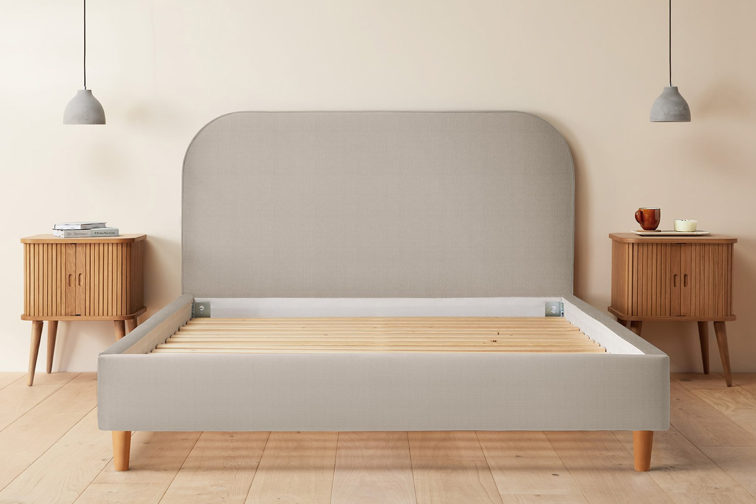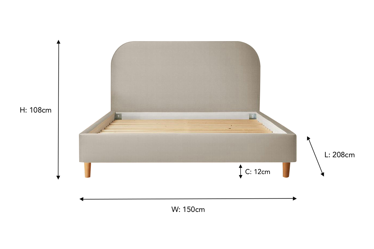 Showcasing a minimalist design that will effortlessly elevate your décor, the headboard boasts a wonderfully padded rounded look that offers the perfect backdrop for late night relaxation. Crafted from wood with a wooden slatted base, this bedframe ensures durability and longevity. While the soft fabric upholstery adds an air of refinement and added comfort, giving your room that cosy feeling.