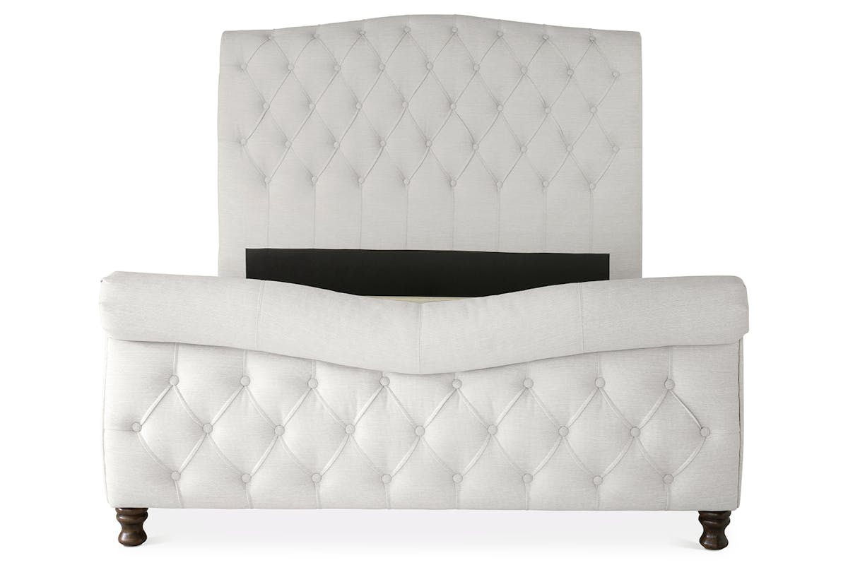 Its platted diamond, scrolled front and headboard in oat upholstery are the first features to catch your eye. Upon closer inspection, the dark stained legs further accentuate the stunning visual the bed provides. The sturdy metal base surrounds the no-sag flat slat base system with a central metal support, providing you with a foundation for optimal sleep.