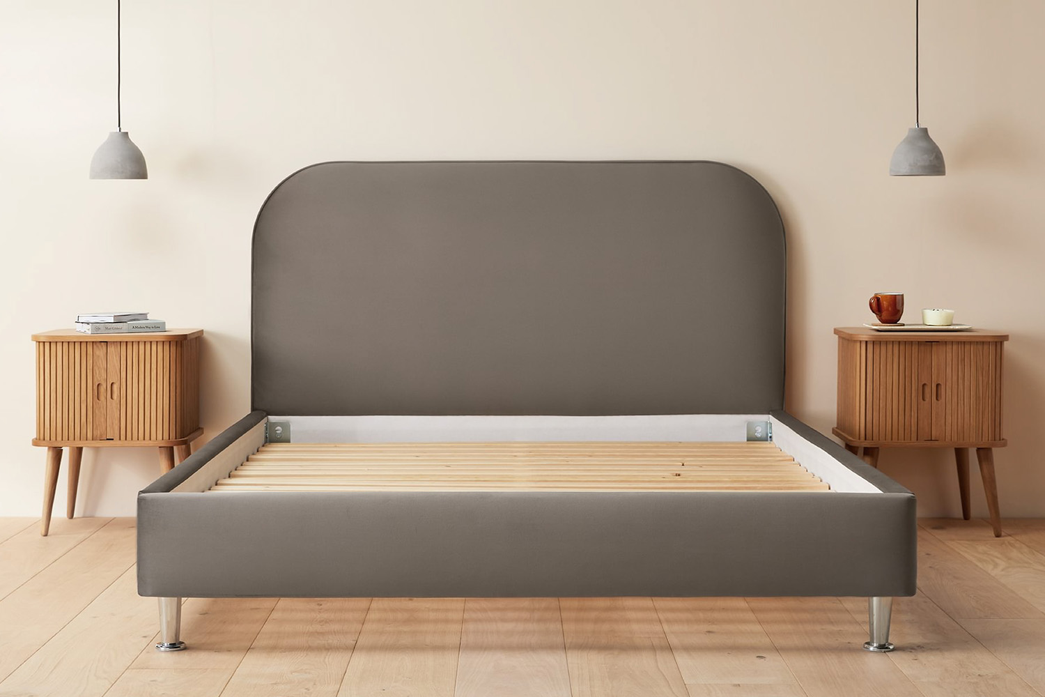Showcasing a minimalist design that will effortlessly elevate your décor, the headboard boasts a wonderfully padded rounded look that offers the perfect backdrop for late night relaxation. Crafted from wood with a wooden slatted base, this bedframe ensures durability and longevity. While the soft fabric upholstery adds an air of refinement and added comfort, giving your room that cosy feeling.
