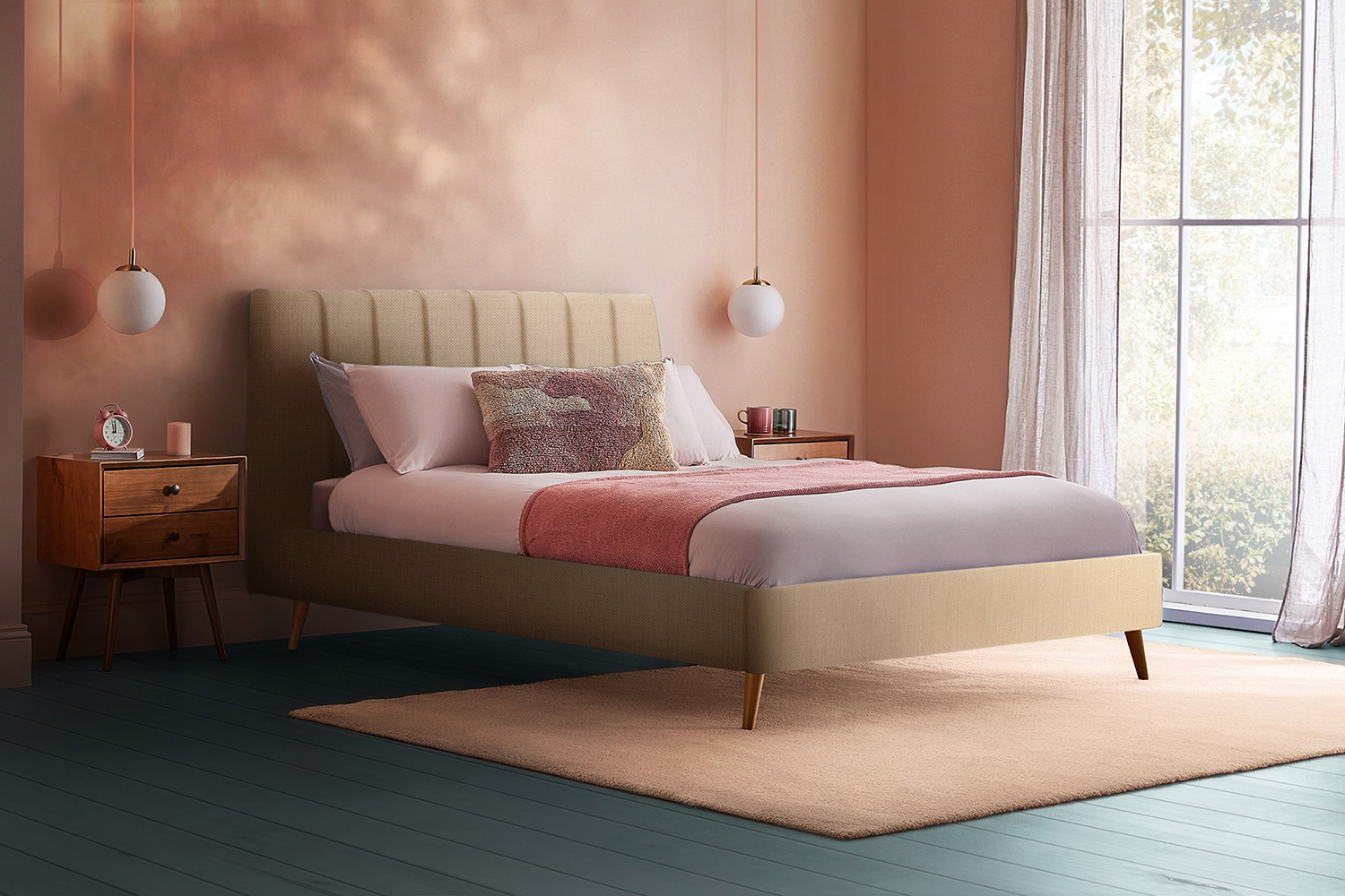 Crafted with precision, the Octavia bed frame features a meticulously upholstered and deeply padded headboard that invites relaxation while commanding attention. Its linear design offers a sleek, modern aesthetic that seamlessly blends with both minimalist and sophisticated interiors. The soft, tactic feel of the fabric exudes comfort, creating an inviting space for rest and rejuvenation. While the wooden base and wooden slats guarantee this piece remains as a focal point in your room for years to come.