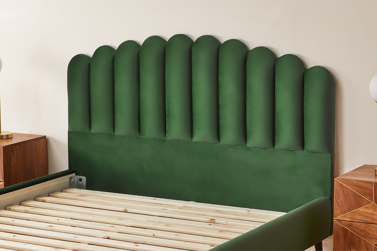 The centrepiece of the Oriana is a deeply padded headboard, sculpted into a graceful seashell silhouette with a refined linear pattern – an artful fusion of classic curves and modern minimalism. It offers both visual drama and cloud-like comfort, inviting you to lean back, relax, and drift into serenity. Crafted from sturdy wood with a wooden slatted base, this bedframe promises enduring quality.