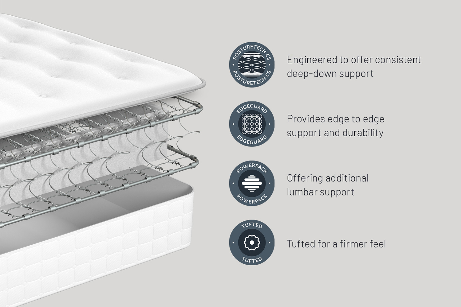 At its core is the PostureTech CoreSupport spring system, which responds progressively to your body weight, becoming supportive as pressure increases. This smart support system provides deep down stability while helping to relieve pressure where you need it most. For added reinforcement, the Powerpack lumbar support works in tandem with the spring unit to deliver extra support to the lower back, helping to reduce aches that can disturb restful sleep. The hand-tufted surface enhances the supportive feel of the mattress while increasing durability, ensuring the comfort layers remain securely in place night after night. Edge-to-edge stability is provided by Edge Guard, offering consistent support right up to the sides of the mattress.