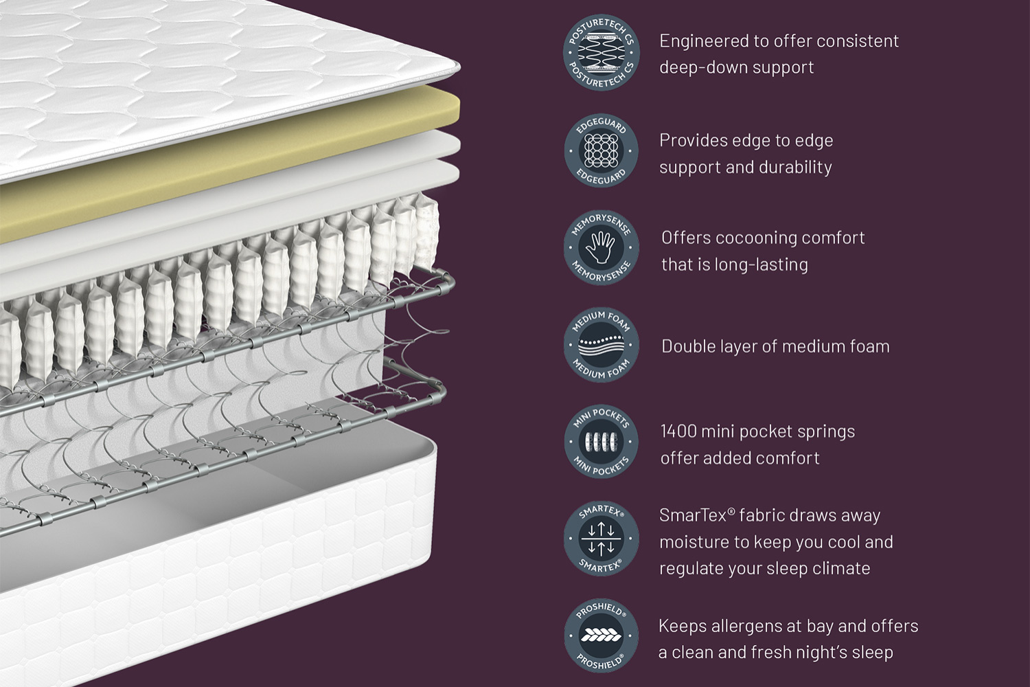 Comfort is taken even further with a generous MemorySense foam layer, which responds to your individual shape to create a gently cocooning sensation. As your body settles into its natural sleep position, MemorySense offers targeted comfort exactly where your body needs it most. A layer of foam completes the comfort stack, adding an extra touch of cushioning support. The mattress is precisely quilted with Sealy’s signature eurotop layer and finished with SmarTex fibres, which help wick away moisture and keep you cool as you sleep. Endorsed by Allergy UK, ProShield technology works to keep allergens at bay, creating a cleaner, fresher, and more hygienic sleep environment.