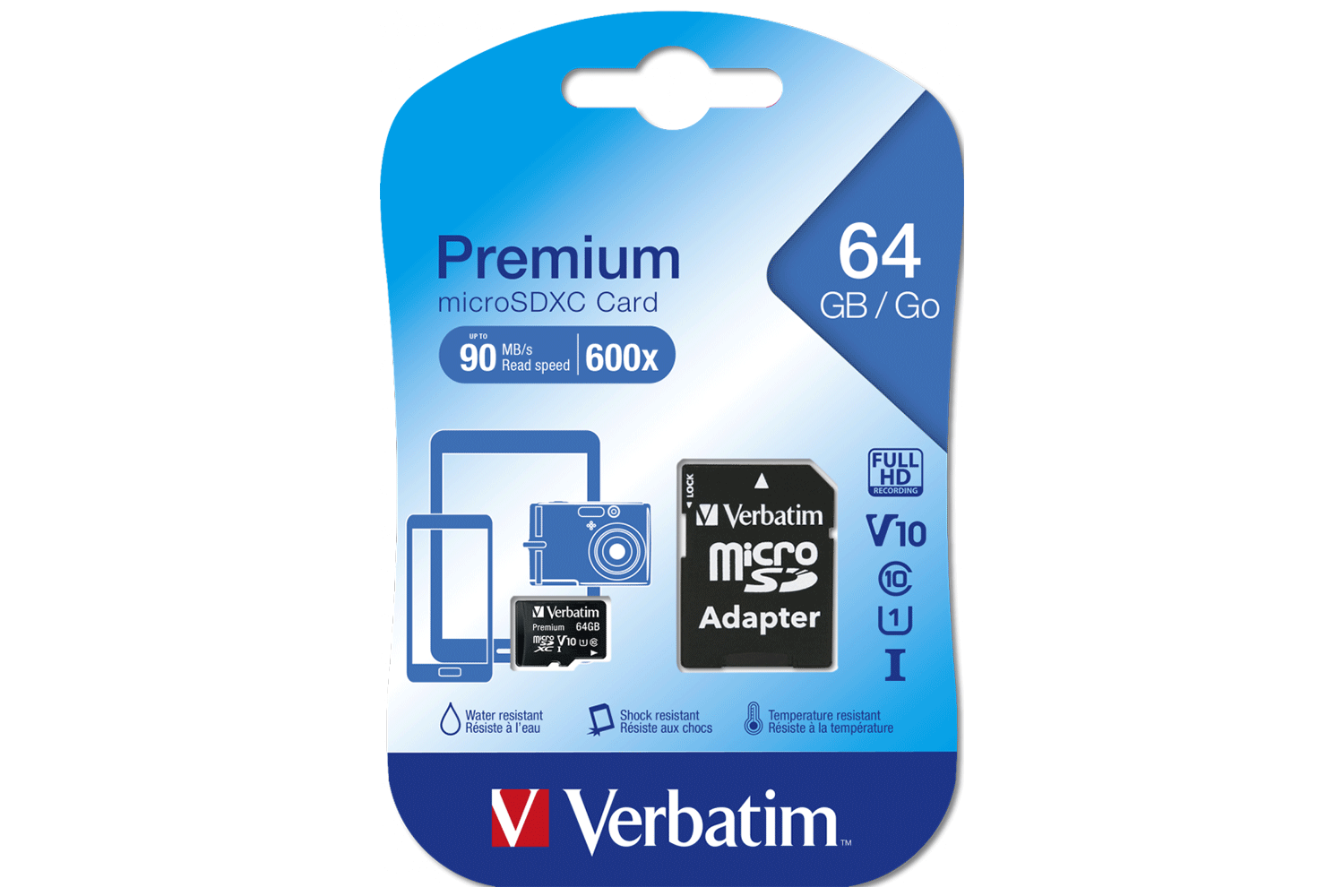 Verbatim Premium microSDHC memory cards are an ideal pairing for smartphones and tablets equipped with a microSD slot. Simply insert the card into the slot and you have the ability to store photos or record video directly to the card, saving valuable space on your mobile device for apps, music and more. Capture full 1080p HD video and richly detailed photography thanks to a UHS-I interface and U1 speed rating.