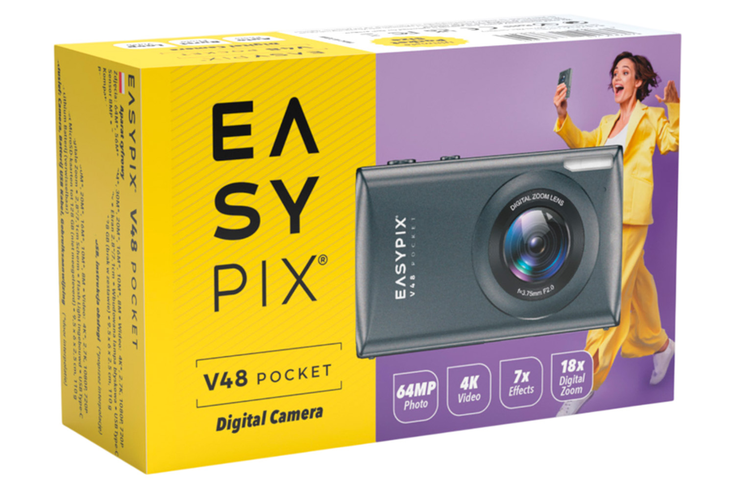 Despite its compact size, the Easypix V48 Pocket offers an 18x digital zoom, allowing you to capture distant subjects in rich detail. Additionally, the camera can record videos in impressive 4K quality – perfect for high-resolution memories or creative short films.