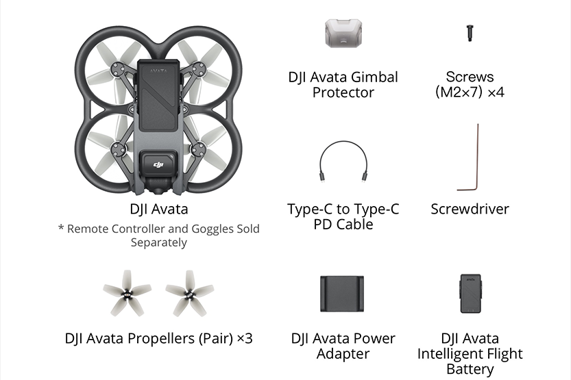 1. DJI Avata is compatible with DJI Goggles 2 (Sold Separately), DJI FPV Remote Controller 2 (Sold Separately), and DJI FPV Goggles V2 (Sold Separately).