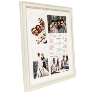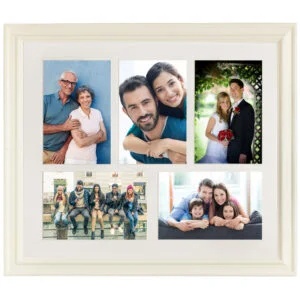 Helena 5 aperture White wood multi aperture frame with a mount. Solid Colour. Wall hanging both horizontal or vertical using sawtooth hangers.