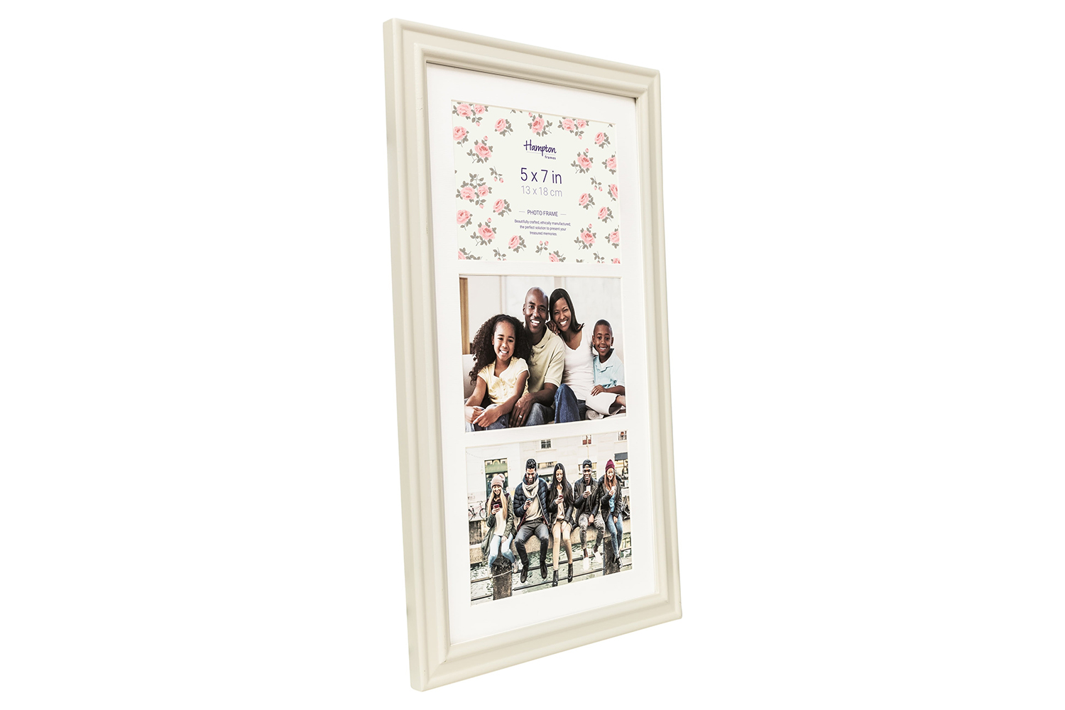 Helena 5×7 triple white wood multi aperture frame with a mount. Solid Colour. Wall hanging both horizontal or vertical using sawtooth hangers.