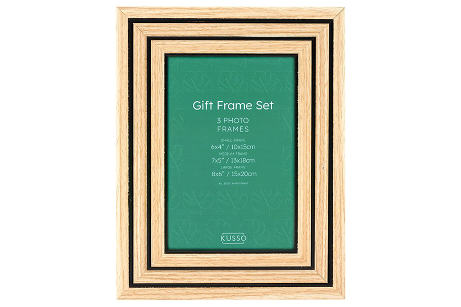 This gift set of three frames is supplied nestled one inside the other, ideal for customers who want a matching set of frames in different sizes. These MDF wrap frames feature striking lines, with a natural wood-effect exterior and a black interior border. The frames are for photo sizes 6x4", 7x5" and 8x6" and feature easel backs for freestanding as well as hooks for wall hanging. This set is supplied shrink wrapped.