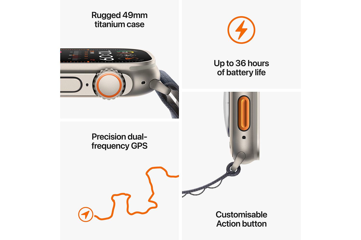 The most rugged and capable Apple Watch. Designed for outdoor adventures and supercharged workouts, with a lightweight titanium case, extra-long battery life and the brightest-ever display. Featuring double tap, a magical way to interact with Apple Watch, and Precision Finding3 to guide you to your iPhone.