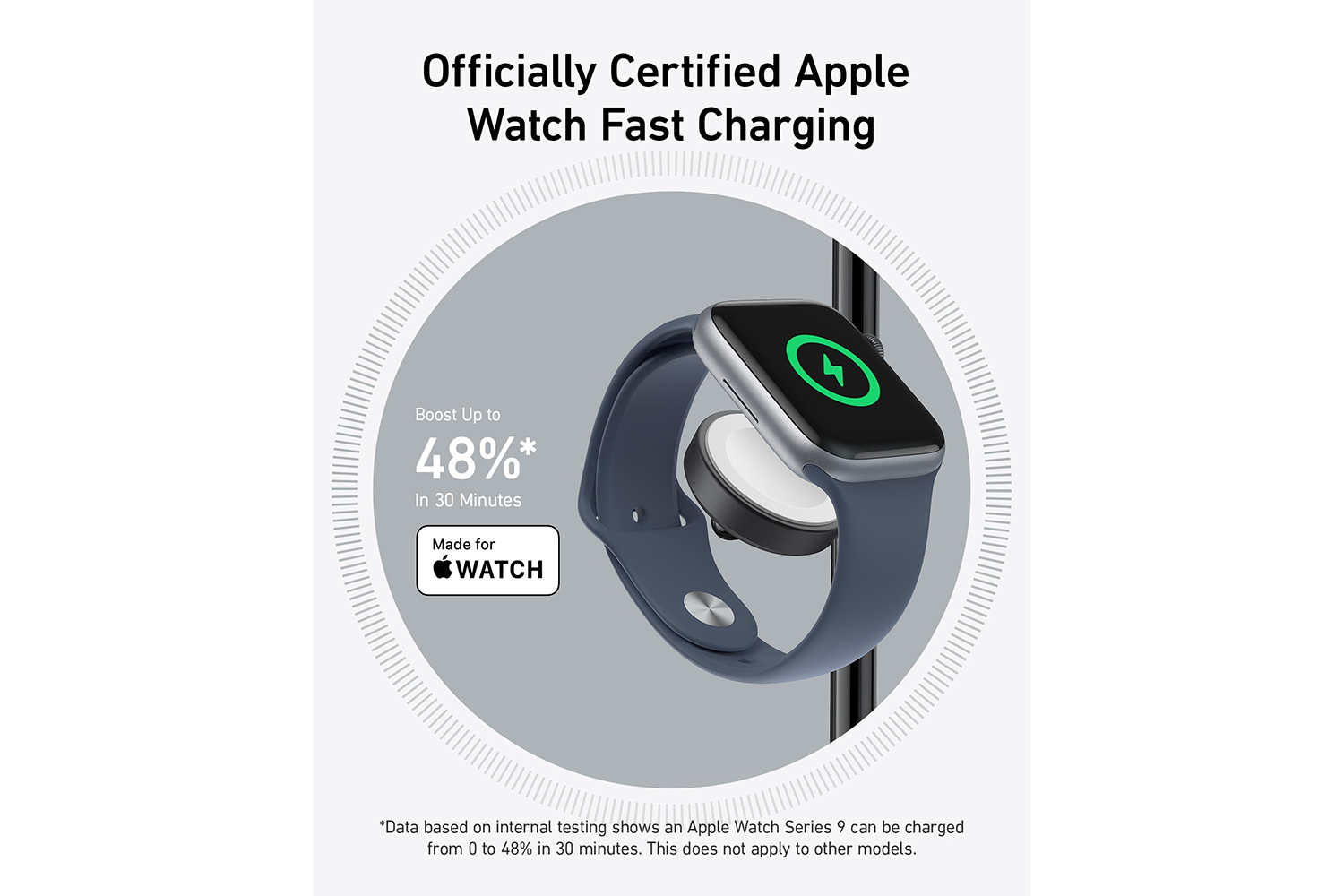 Anker maggo wireless charging station uses officially ceritfied apple fast charging technology. This ensures your apple watch can reach 48% with just a short 30 minutes charge.
