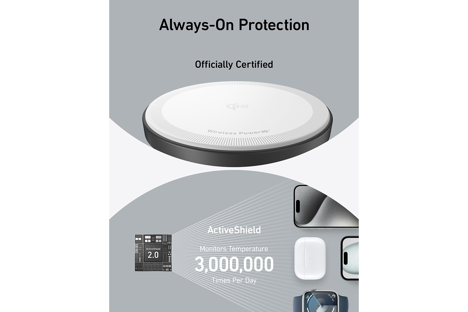 Equipped with activeshield 2.0, this wireless charging station performs more than 3,000,000 temperature checks daily to maintain an ideal temperature during 15w fast charging sessions.