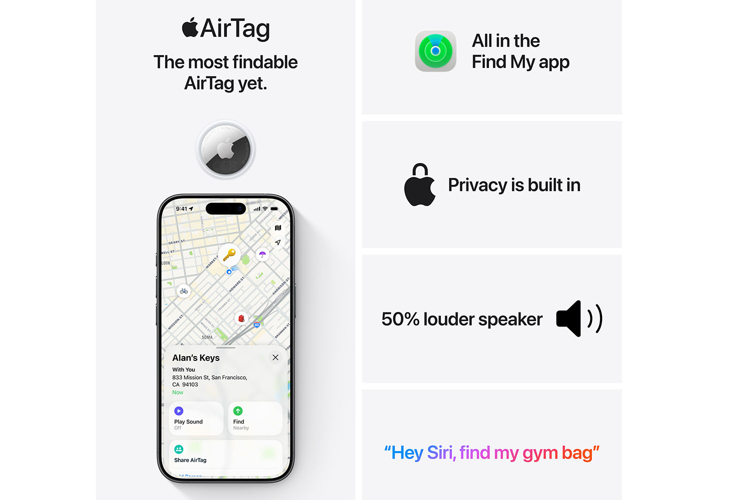 With a 50% louder speaker and a new, distinctive chime, it’s easier than ever to hear and find AirTag.[1]
