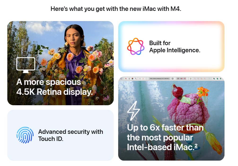 2.Testing conducted by Apple in September and October 2024 using pre‑production 24‑inch iMac systems with Apple M4, 10‑core CPU, 10‑core GPU and 16GB of RAM, as well as production 3.0GHz 6‑core Intel Core i5–based 21.5‑inch iMac systems with Radeon Pro 560X with 4GB of GDDR5 memory and 8GB of RAM, all configured with 256GB SSD. Tested using Super Resolution with Photomator 3.3.23 and a 4.4MB image. Performance tests are conducted using specific computer systems and reflect the approximate performance of iMac.