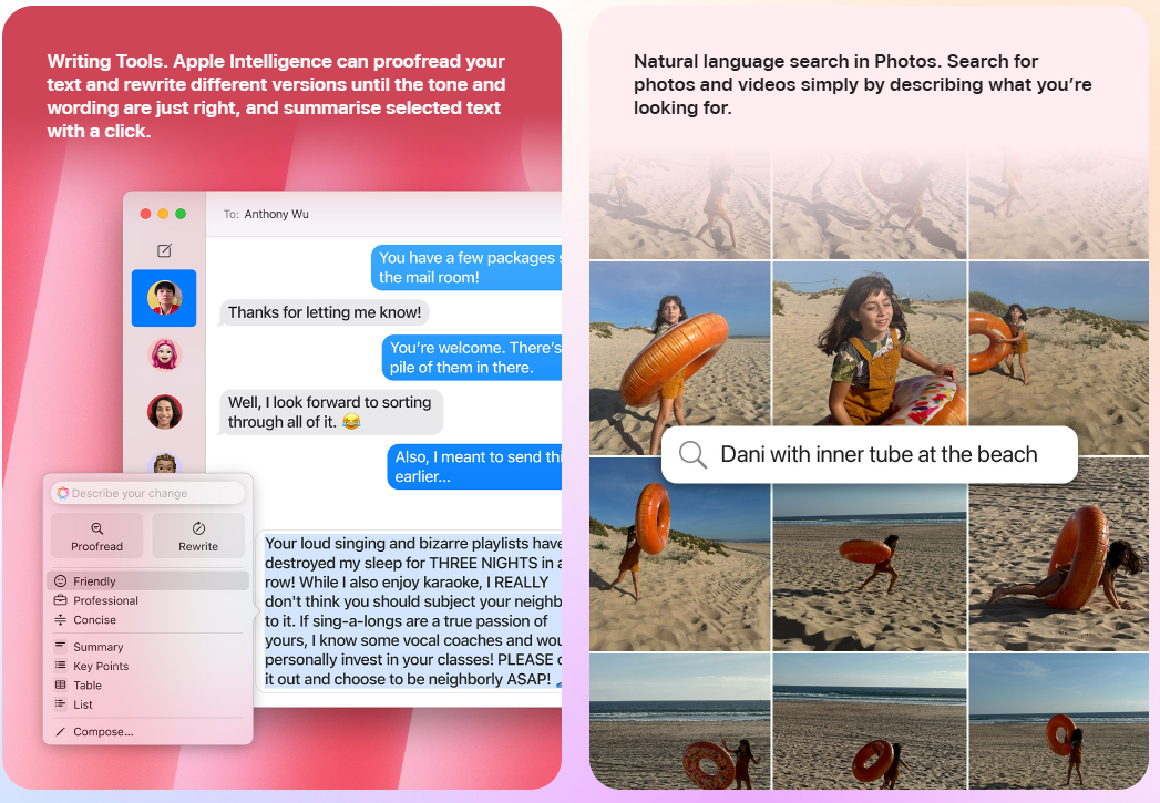 1.Apple Intelligence is available in beta on all Mac models with M1 and later, with Siri and device language set to Chinese (Simplified), English (Australia, Canada, India, Ireland, New Zealand, Singapore, South Africa, UK or US), French, German, Italian, Japanese, Korean, Portuguese (Brazil) or Spanish, as a macOS Sequoia update, with more languages coming over the course of the year, including Vietnamese. Some features may not be available in all regions or languages.