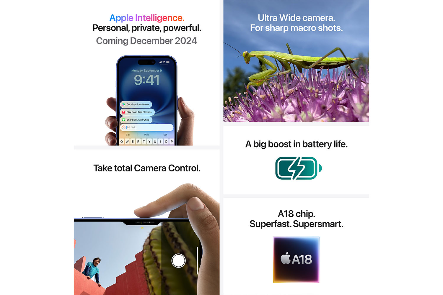 Meet A18. A custom-built chip that jumps two generations ahead of the A16 Bionic chip in iPhone 15. And it powers next-level camera features like Photographic Styles and Camera Control. All with exceptional power efficiency to extend battery life.