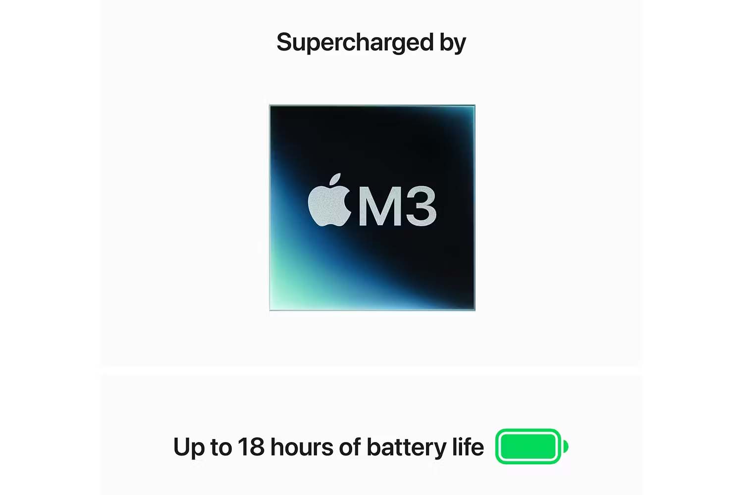 29. Testing conducted by Apple in January 2024 using pre-production 15‑inch MacBook Air systems with Apple M3, 8‑core CPU and 10‑core GPU, and pre-production 13‑inch MacBook Air systems with Apple M3, 8‑core CPU and 8‑core GPU, all configured with 8GB of RAM and 256GB SSD. Testing conducted by Apple in May 2022 using pre‑production 13‑inch MacBook Air systems with Apple M2, 8‑core CPU, 8‑core GPU, 8GB of RAM and 256GB SSD. The wireless web test measures battery life by wirelessly browsing 25 popular websites with display brightness set to 8 clicks from bottom. The Apple TV app movie playback test measures battery life by playing back HD 1080p content with display brightness set to 8 clicks from bottom. Battery life varies by use and configuration. See apple.com/ie/batteries for more information.
