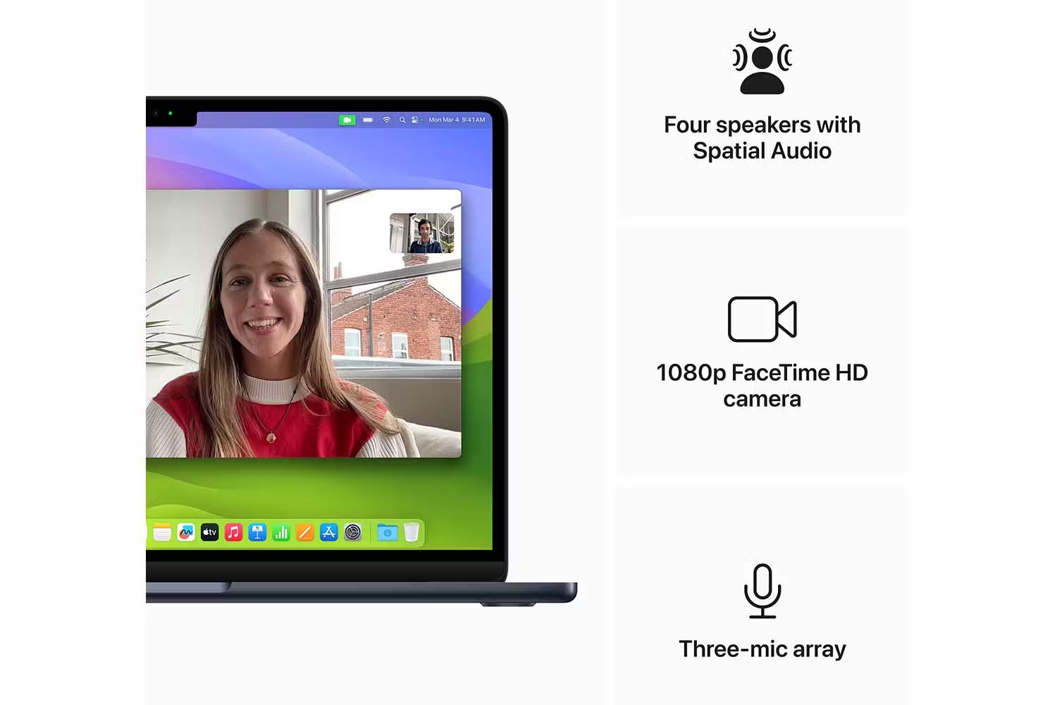 Come through loud and clear on calls wherever you are, thanks to the three-mic array with advanced beamforming algorithms to capture clean audio. MacBook Air with M3 has features that bring enhanced voice clarity to audio and video calls.