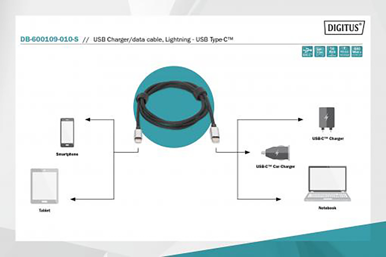 Use the Lightning connector to connect your iPhone, iPad or iPod to your USB-C'' capable MacBook, notebook or PC to synchronize or charge. This cable can also be used with a USB-CTM' charger. The charging adapters are compatible with 29, 30, 61 and 87 watt power. Numerous iPhone® and iPad Pro® models also support Power Delivery 2.0 quick charge function. The maximum supported charging power of the MFI-certified cable is 18 W.