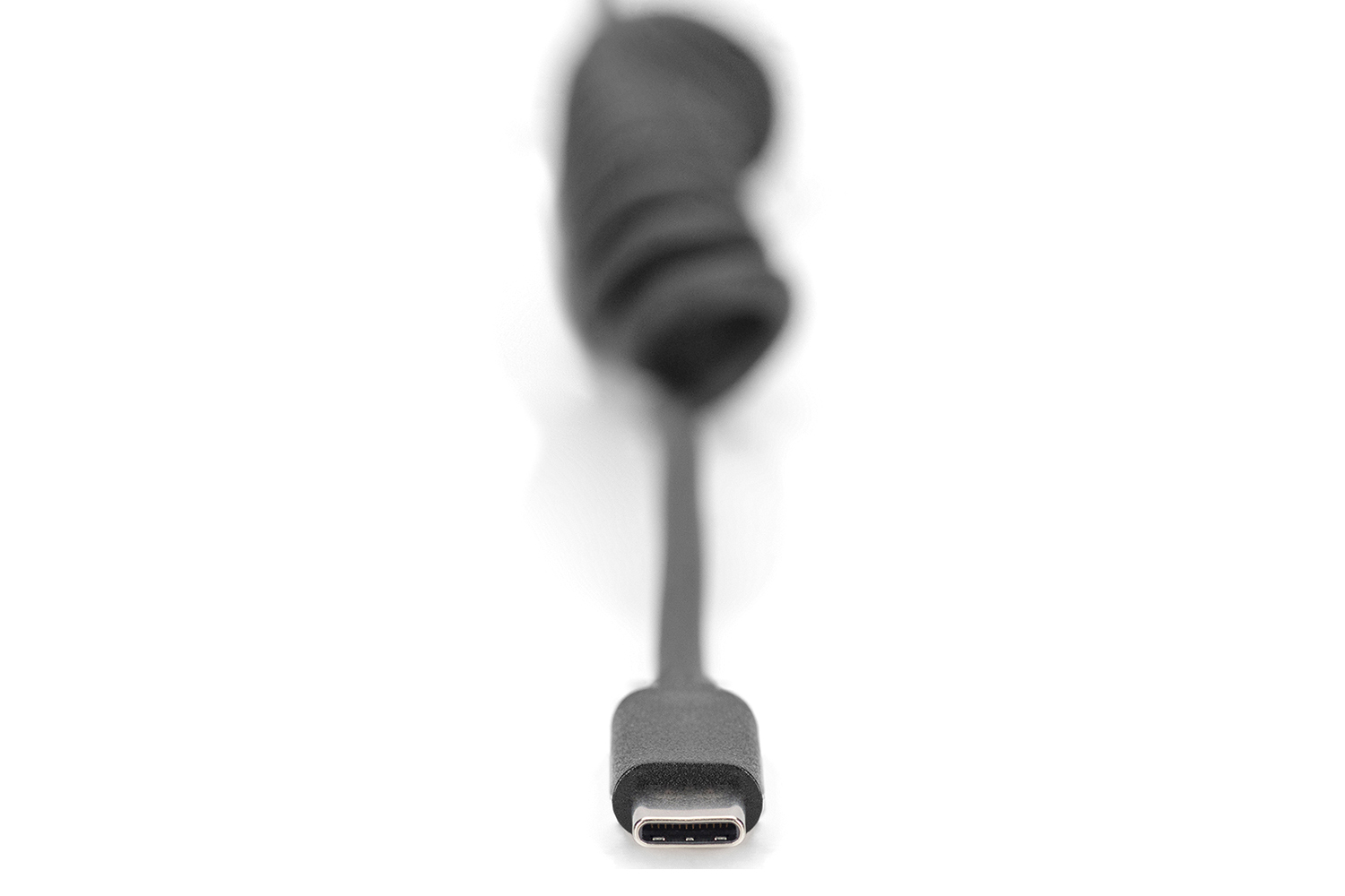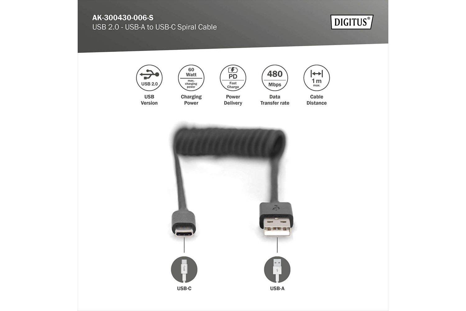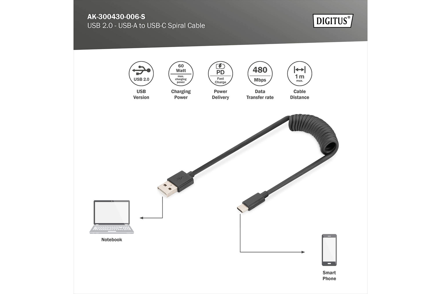 With the DIGITUS USB 2.0 - USB A to USB C Spiral Cable, you can charge your smart devices such as smartphones, tablets etc. The charging power is 60W (20V/3A). In addition, you can synchronize your data with the PC or notebook at a data transfer rate of 480 Mbps. Thanks to the flexible length and spiral design, it can be used anywhere. Perfect in the car to charge your smartphone or as a spare cable for your desk, since the cable is easy to store anywhere.