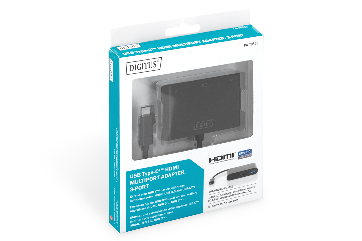 The USB Type-C HDMI multiport adapter, 3-port extends your USB-C device with three additional ports. Use the HDMI port to connect an additional TV set or monitor to your laptop or hold a presentation with a projector. The highest possible resolution is UHD (4K/30Hz). In addition, the adapter has a USB 3.0 port to connect external USB devices. It also complies with USB-BC specification 1.2 (USB Battery Charging) and is thus suitable for charging mobile devices (max. 5V/1.5A). Moreover, it features a USB-C port with Power Delivery (PD) 2.0 functionality to power your laptop while using the adapter. The multiport adapter is suitable for all operating systems: Windows, Mac, Google Chrome.