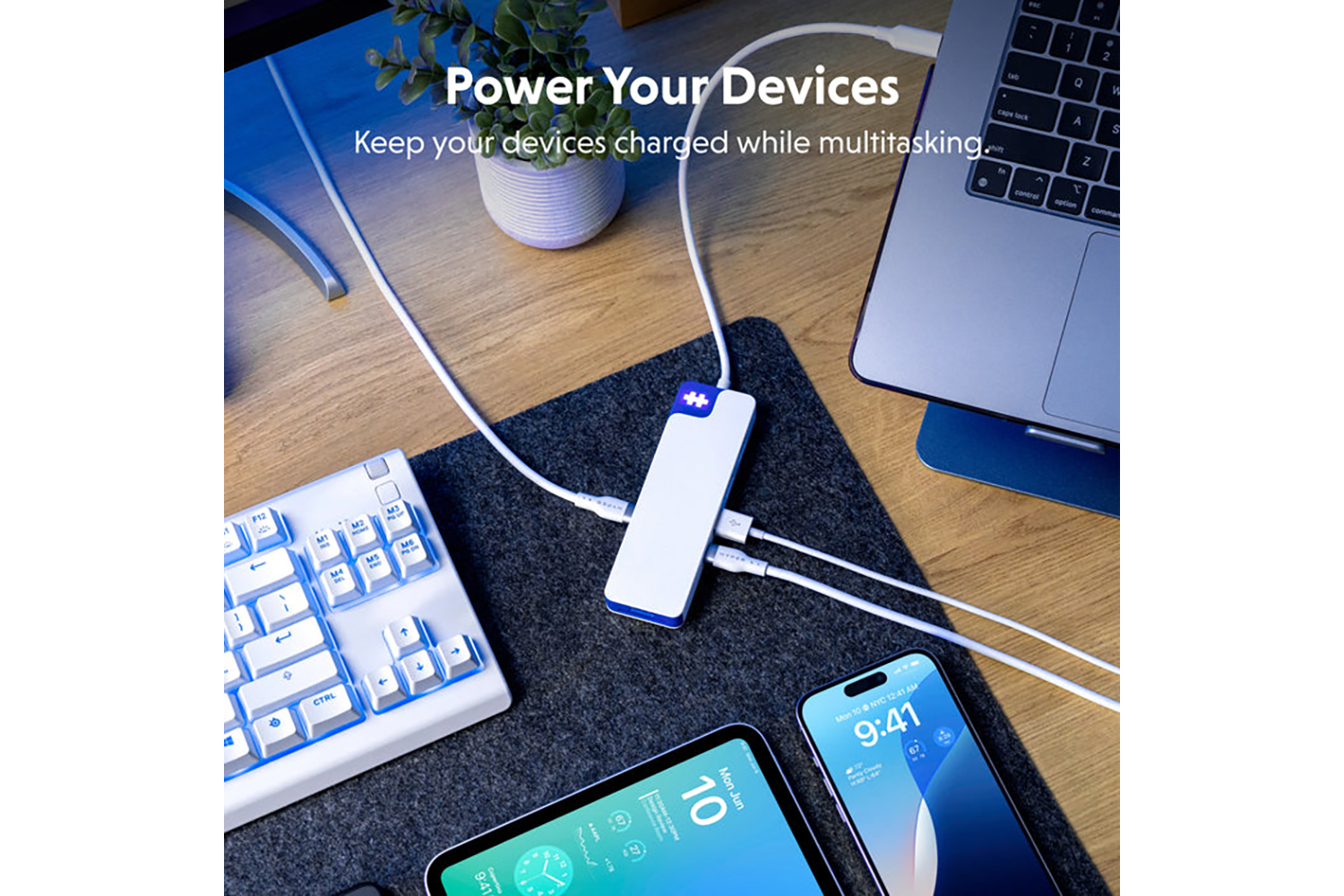 Charge your laptop, tablet, and more through the USB-C 100W Power Delivery port, while powering other connected devices simultaneously.