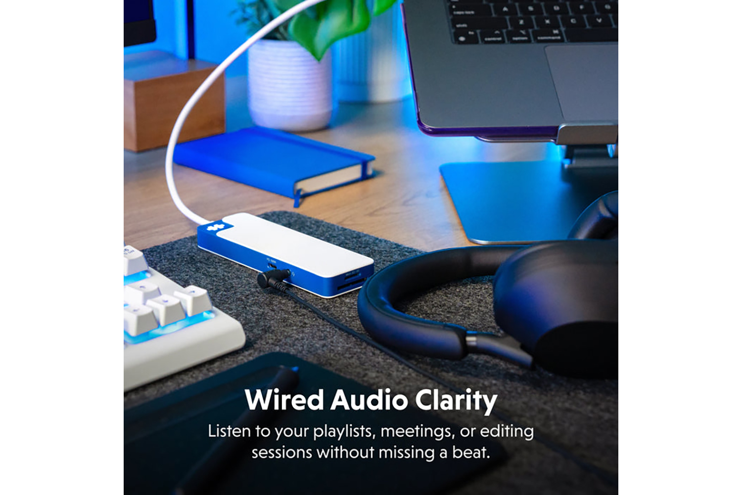 Access high-res files with SD card support, plug in all your essential devices, and enjoy wired audio—all in a hub crafted with 75% recycled materials.