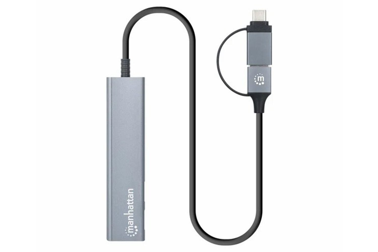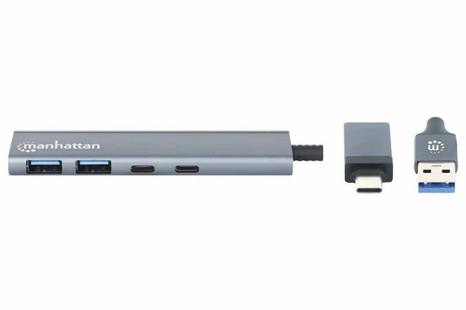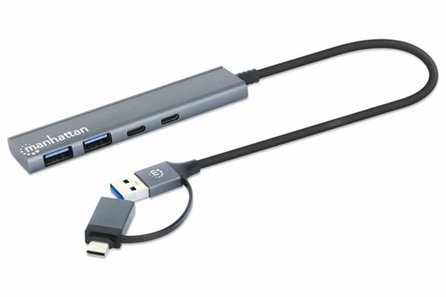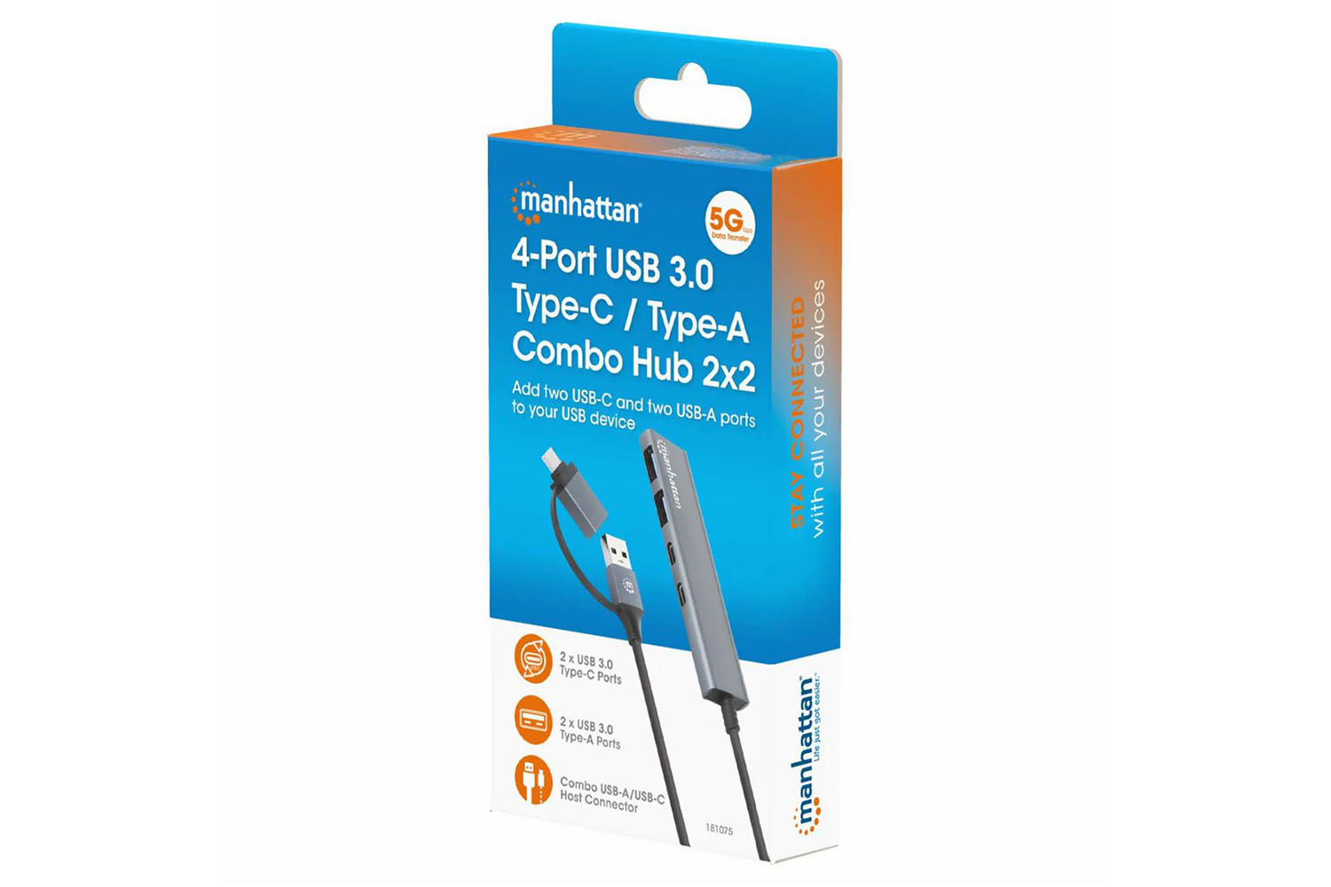 The Manhattan 4-Port USB 3.0 Type-C / Type-A Combo Hub expands one of your device's USB ports into two USB-A ports and two USB-C ports, so you can easily connect a keyboard, mouse, flash drive or phone. Devices that support the USB 3.2 Gen 1 spec (formerly known as USB 3.0) can reach transfer speeds up to 5 Gbps for external storage, printing and more. The Hub's SuperSpeed ports are backward compatible with USB versions 2.0 or even 1.1. You can also charge your phone or tablet since the Hub supplies up to 5 V / 0.9 A of power.