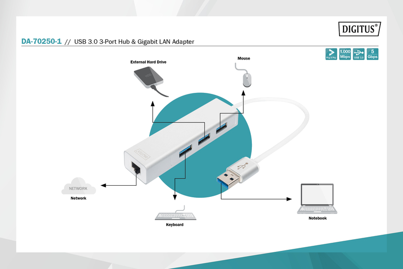 With the Digituso USB 3.0 Hub & Gigabit LAN Adapter you can connect 3 additional USB 3.0 high speed devices to your Ultrabook, notebook, subnotebook, Macbook, Macbook Air etc. Printers, hard drives, flash memory, card reader, speakers and many more devices can be easily connected via the USB interface. In addition, the adapter extends your computer to an gigabit Ethernet port and makes it networable, because nowadays the most mobile devices can only be integrated into the network via wireless LAN.