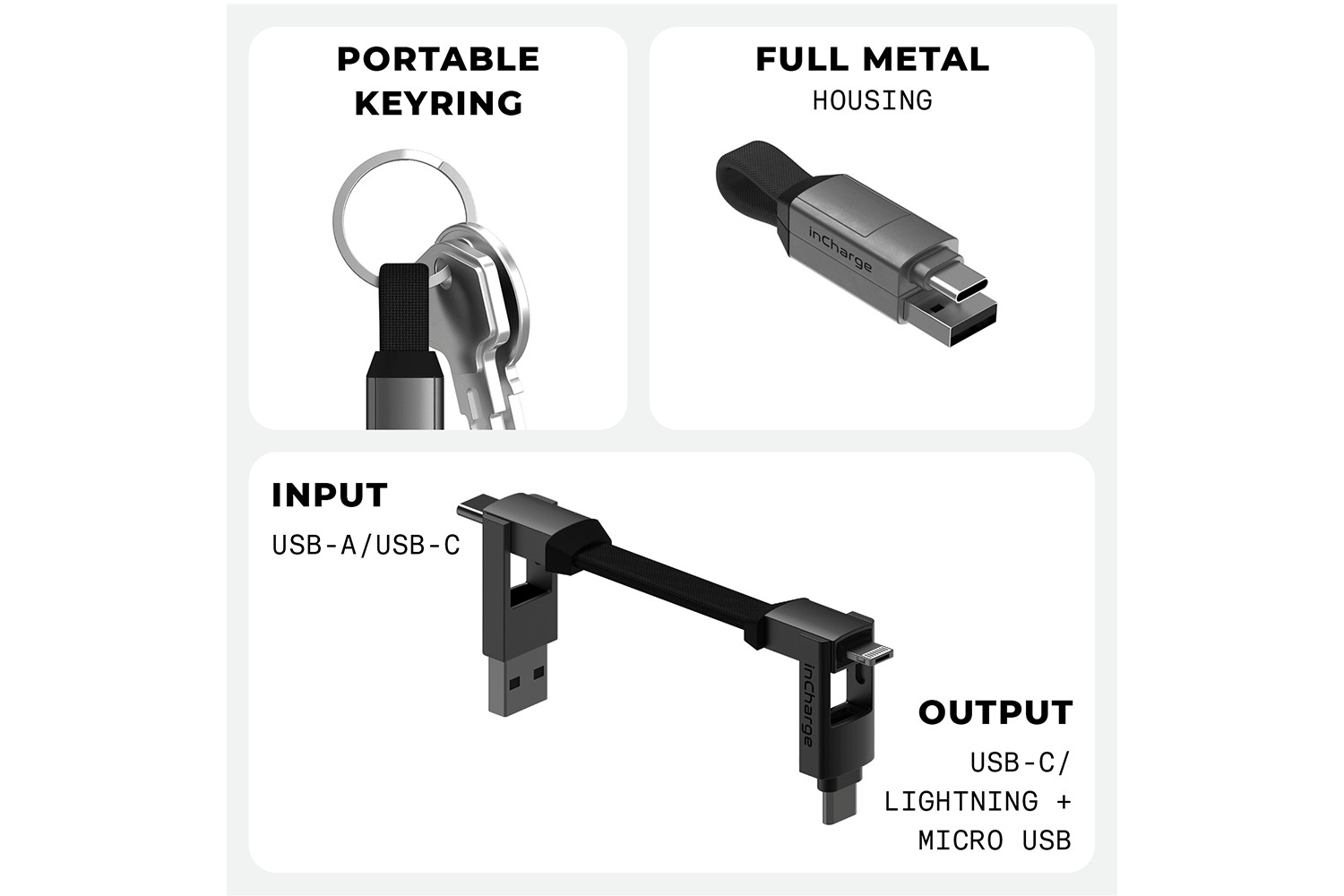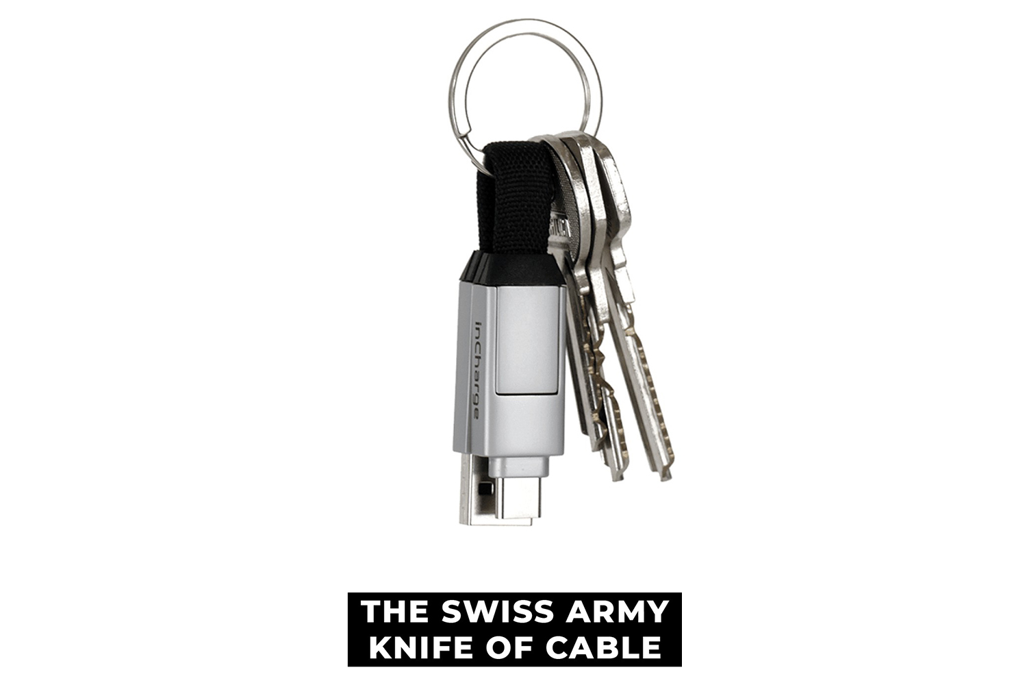 InCharge 6 is the keyring cable to rule them all. Thanks to its patented design, it allows you to have 6 different charging cables on your keychain, so it’s never left behind.